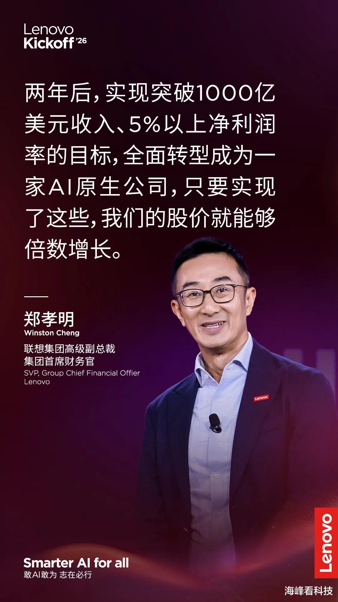 在这样的背景下,联想为自己设定了清晰的阶段性目标:未来两年,全面推进混合式人工智能战略落地,在AI普惠加速推进的窗口期内,持续提升营收规模与盈利能力,并向1000亿美元营收迈进。这一目标不仅对应规模增长,也被视为其第五次创业阶段的重要里程碑。