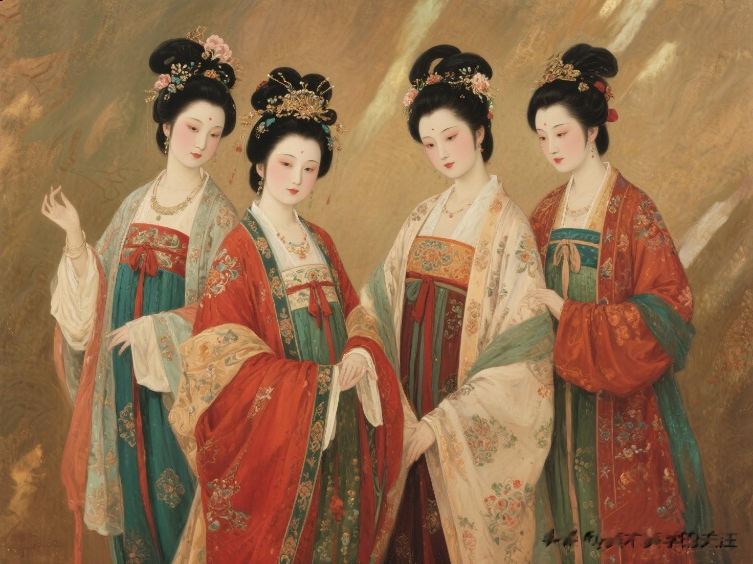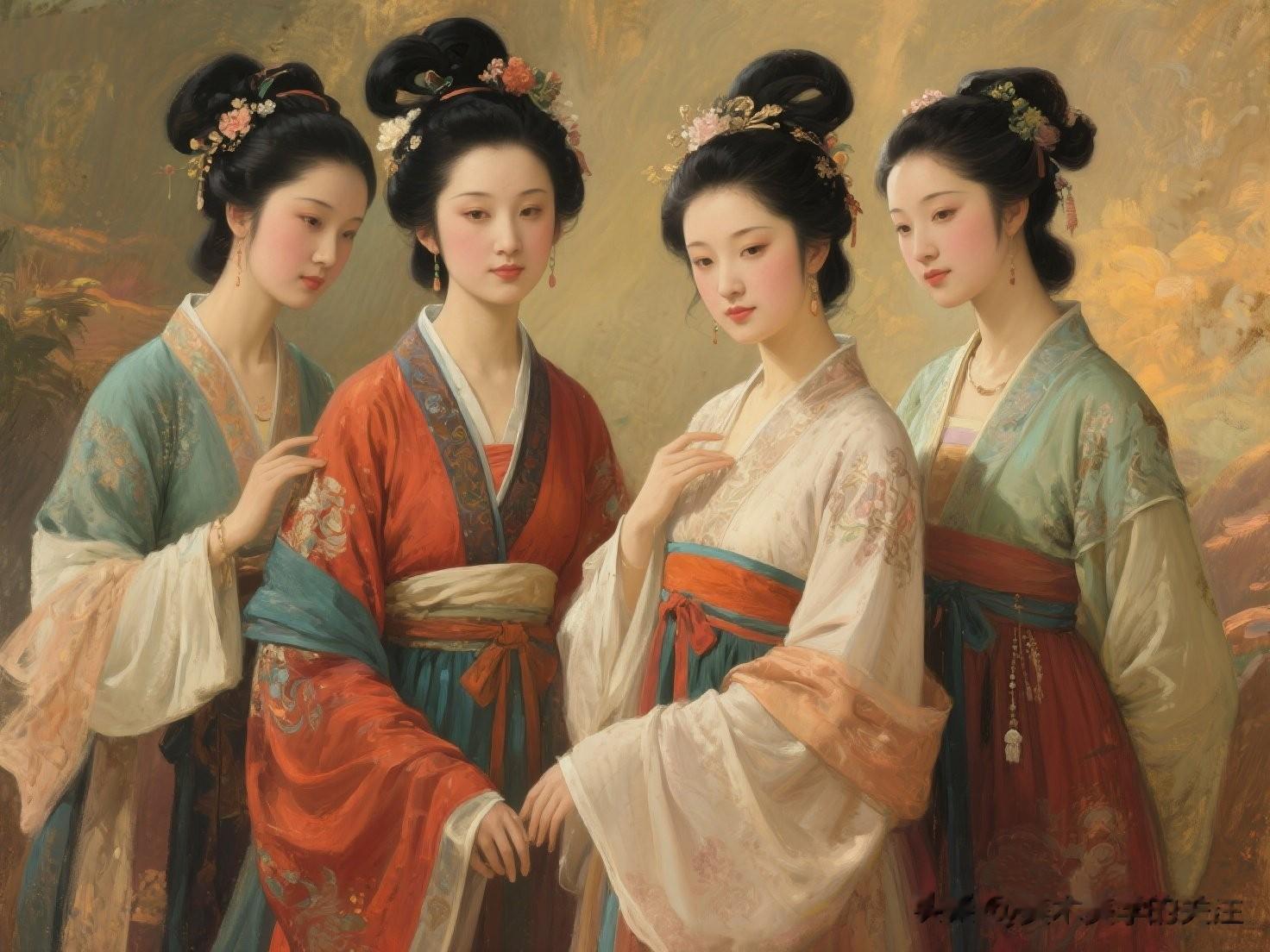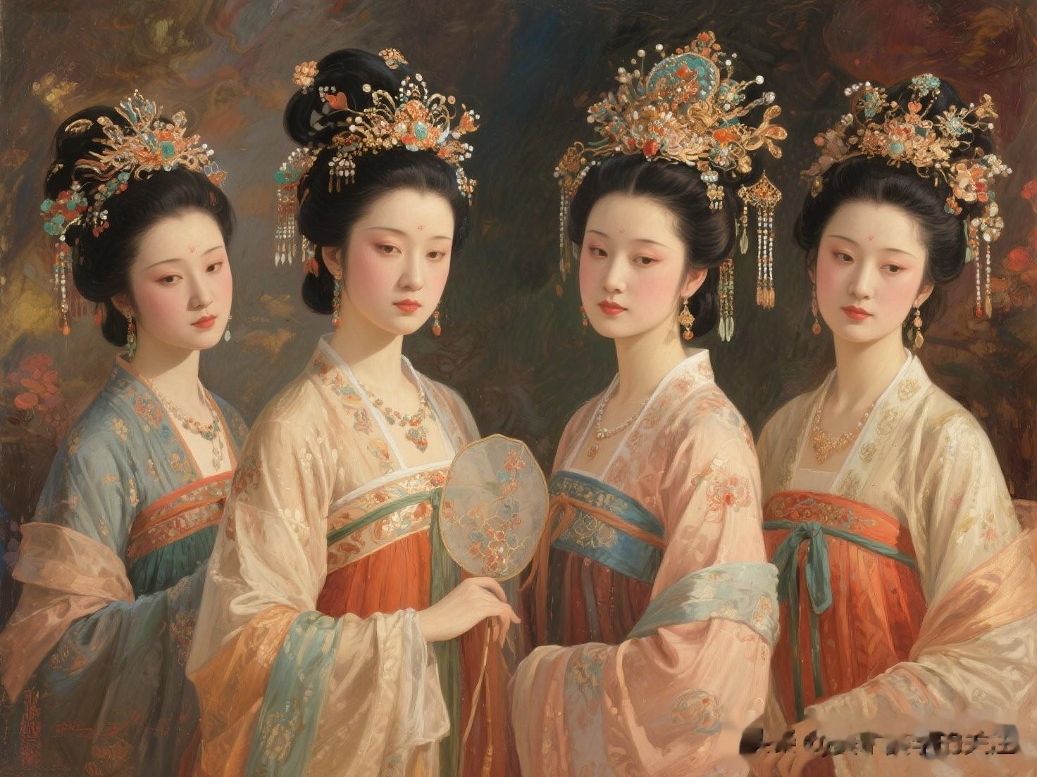 再看她们的服饰,那是一场宋代服饰文化的华丽展示。四位美人的服饰色彩鲜艳而不失庄重,或为淡雅的浅色系,如浅粉、淡绿,宛如春日里盛开的花朵,散发着清新的气息;或为浓郁的深色系,如绛红、深蓝,恰似夜空中的繁星,透着高贵与神秘。服饰上的花纹精致细腻,有繁复的花卉图案,那盛开的花朵仿佛在衣袂间随风摇曳,充满了生机;还有精美的几何图案,线条流畅,对称而富有韵律感,彰显出宋代工艺的高超水准。这些服饰的样式,宽袍大袖,长裙曳地,走起路来衣袂飘飘,既符合宋代服饰的特点,又赋予了人物一种飘逸出尘的气质。