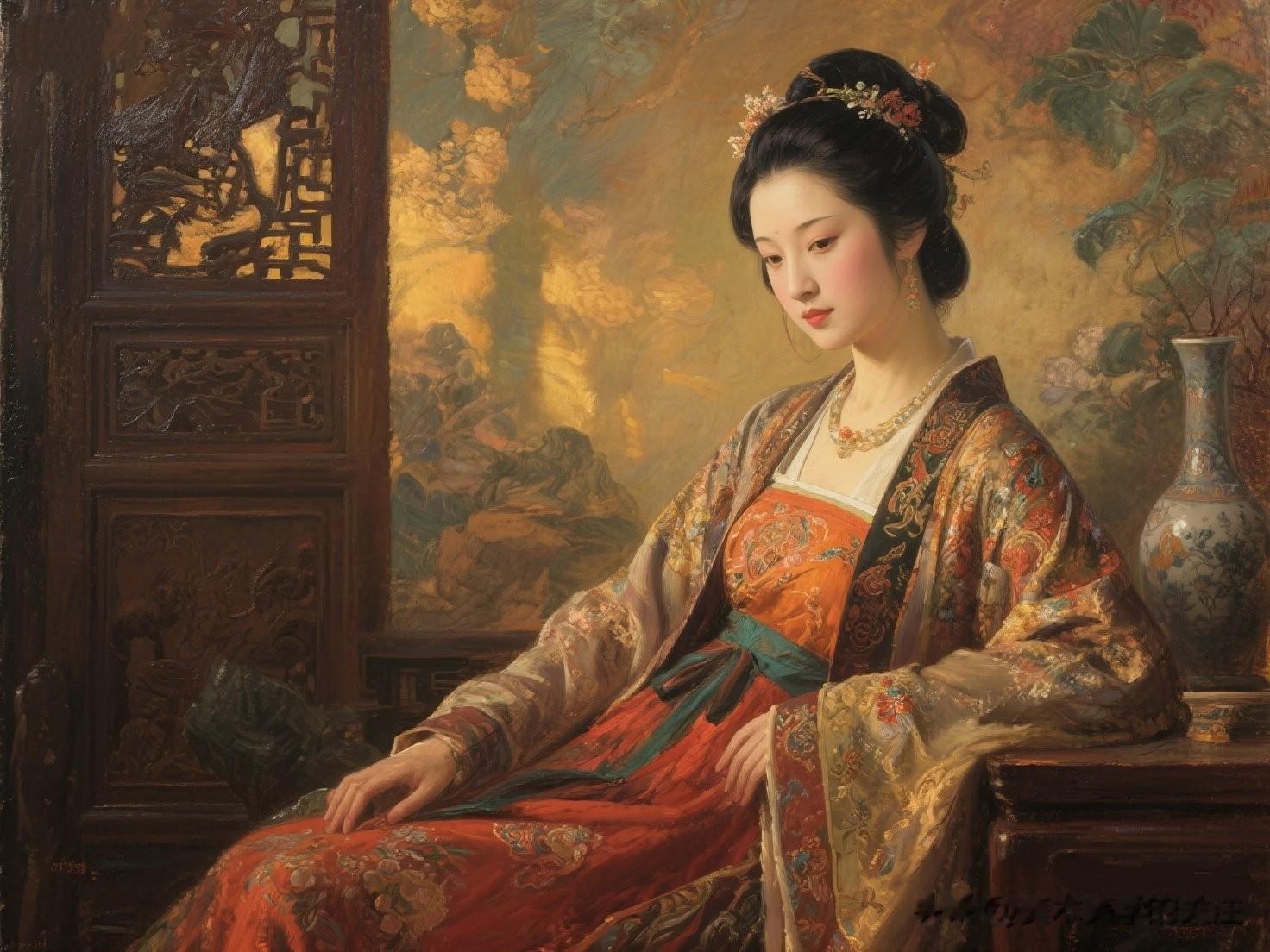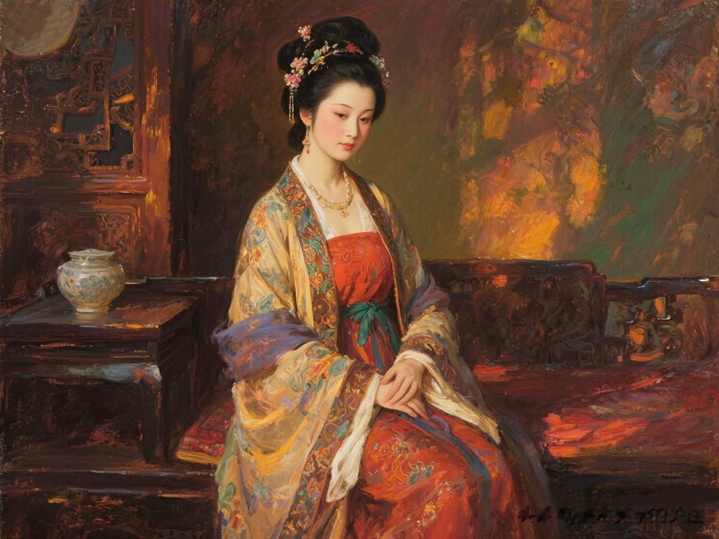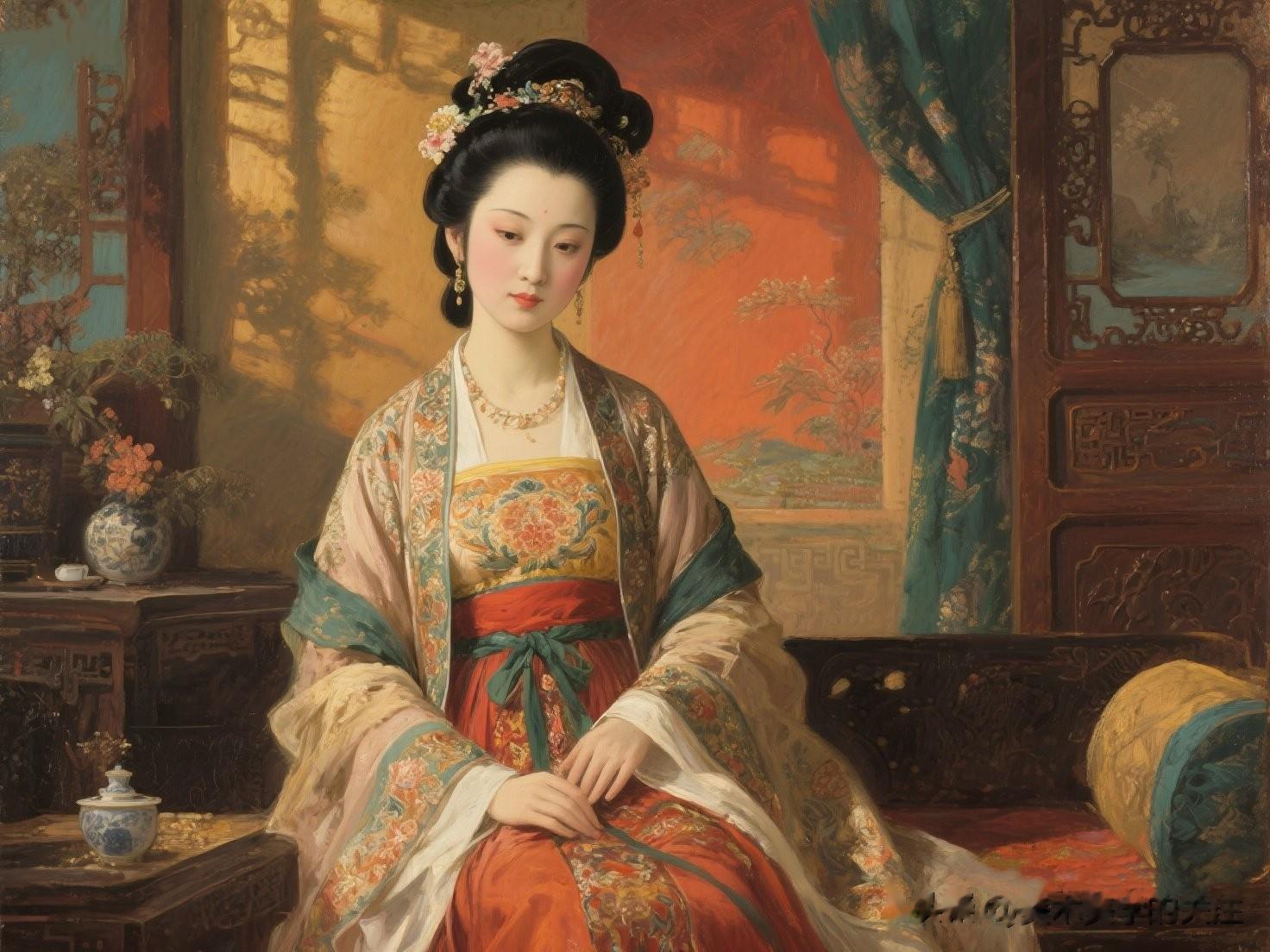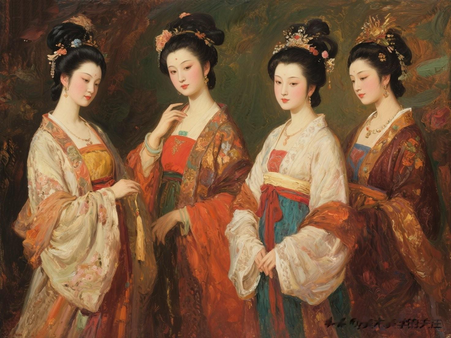 再看她们的服饰,那是一场宋代服饰文化的华丽展示。四位美人的服饰色彩鲜艳而不失庄重,或为淡雅的浅色系,如浅粉、淡绿,宛如春日里盛开的花朵,散发着清新的气息;或为浓郁的深色系,如绛红、深蓝,恰似夜空中的繁星,透着高贵与神秘。服饰上的花纹精致细腻,有繁复的花卉图案,那盛开的花朵仿佛在衣袂间随风摇曳,充满了生机;还有精美的几何图案,线条流畅,对称而富有韵律感,彰显出宋代工艺的高超水准。这些服饰的样式,宽袍大袖,长裙曳地,走起路来衣袂飘飘,既符合宋代服饰的特点,又赋予了人物一种飘逸出尘的气质。