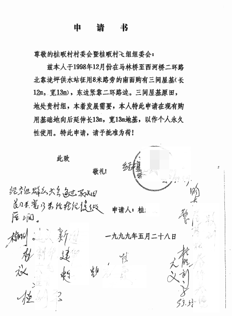 1999 年村组转让 169 平方米地块该地块为桂畈村荒地,紧邻桂先生此前获得的三间宅基地。桂先生介绍,当时通过合法流程从桂畈村委会及村民代表处受让该地块,受让事宜经村民大会讨论同意,他在现场向村民支付了相应款项,村民们在其宅基地申请书中集体签名确认,同时留存了收款条。