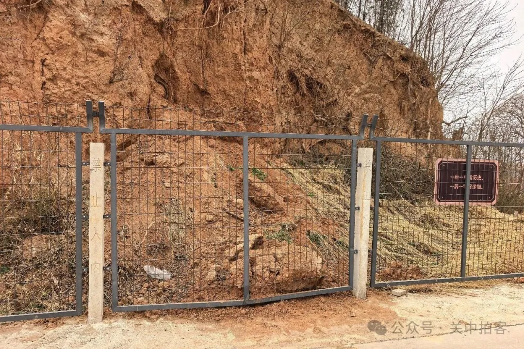 将车停在路边,走到墓冢旁边,由于围栏环绕,无法进入参观,只能隔着栏网仰望残破的封土。这座墓冢呈圆形,高度约20米,直径约35米。顶部保存较好,种植大量树木;下部破坏严重,被削成陡立状。