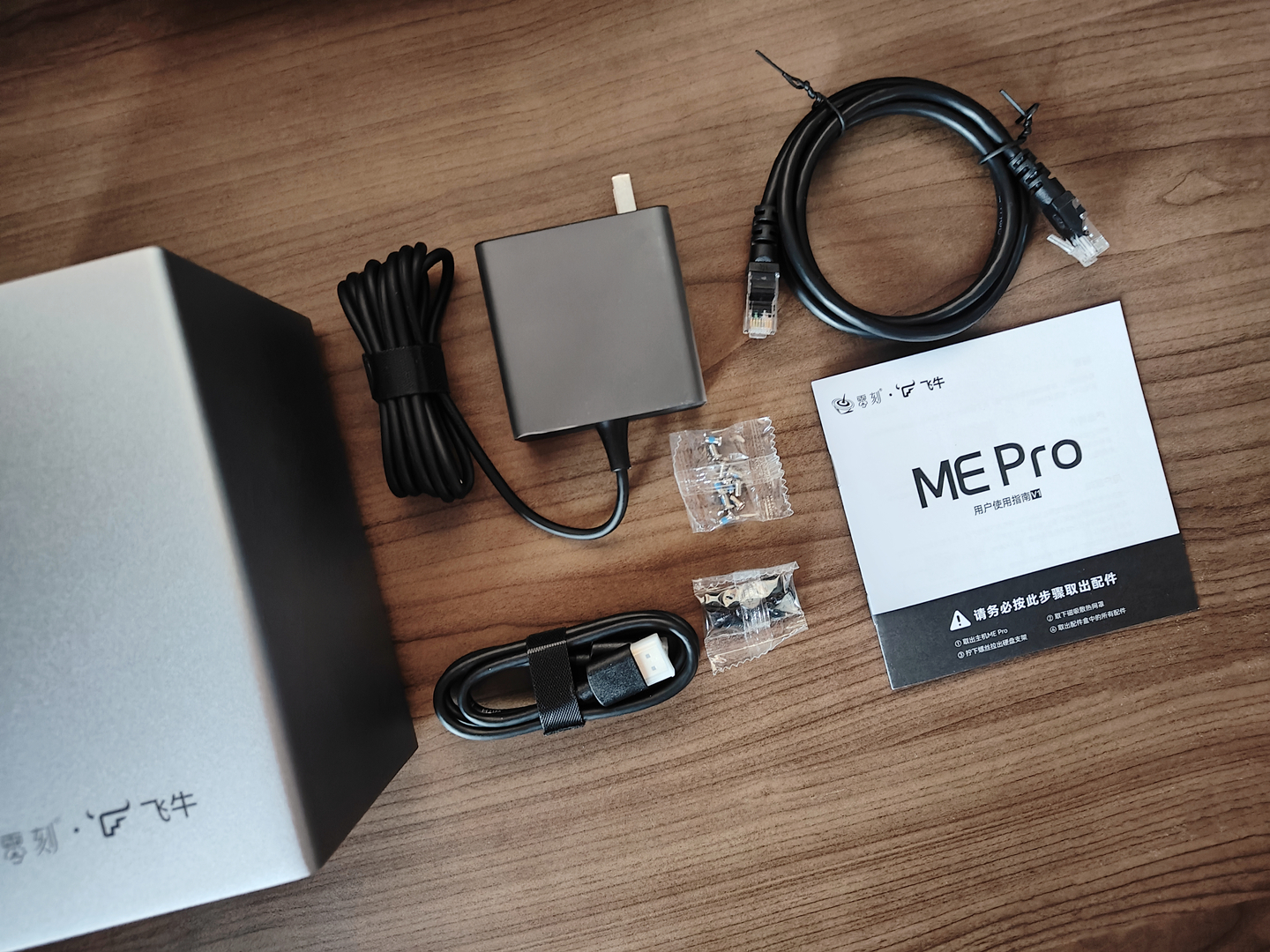 除零刻me pro主机,配件包括说明书(含保修卡)、M3螺丝两包,120W电源适配器,100cmHDMI线、100cm网线。
