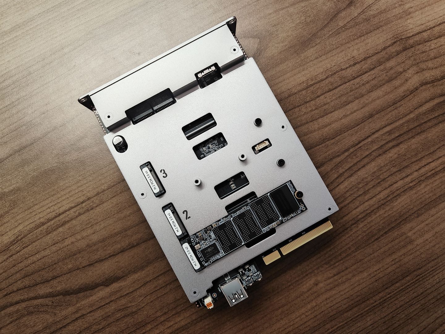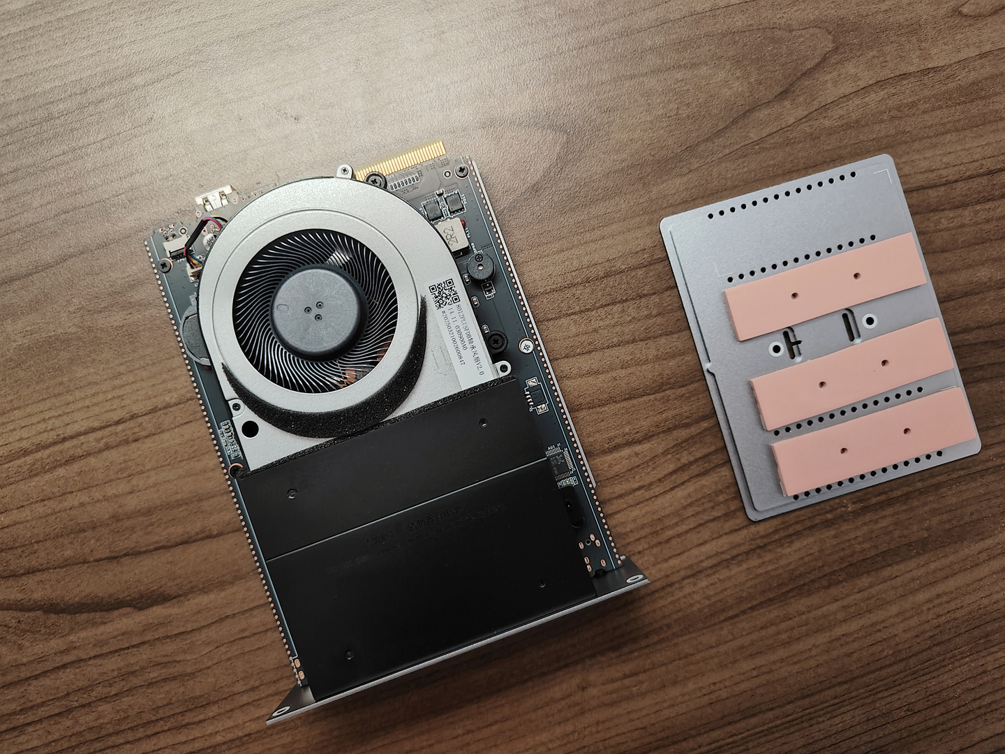 打开机身后盖,这里是SSD插槽,零刻me pro支持M.2插槽*3(单条SSD最高支持4TB扩容)+机械硬盘插槽*2(支持2.5/3.5英寸SATA硬盘,单盘位最高支持30TB扩容)存储组合,一共72TB海量存储,可以按需扩容,全家数据一机搞定。