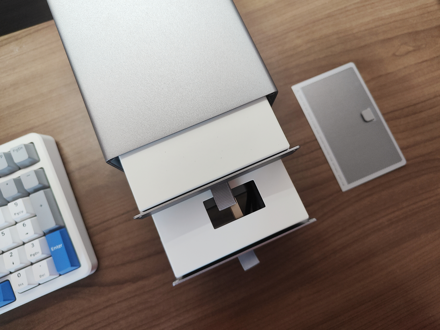 打开背部的磁吸散热网罩,里面内置了两个抽屉式硬盘架,零刻me pro的DIY抽屉式设计,更方便后期升级主板,支持主板升级到Intel N系列/Intel 12,13,14,15代/AMD FP8系列/arm架构等,我的设备我作主。平时一拉就可以方便给机器清灰,这样的设计真的考虑得太周到了。