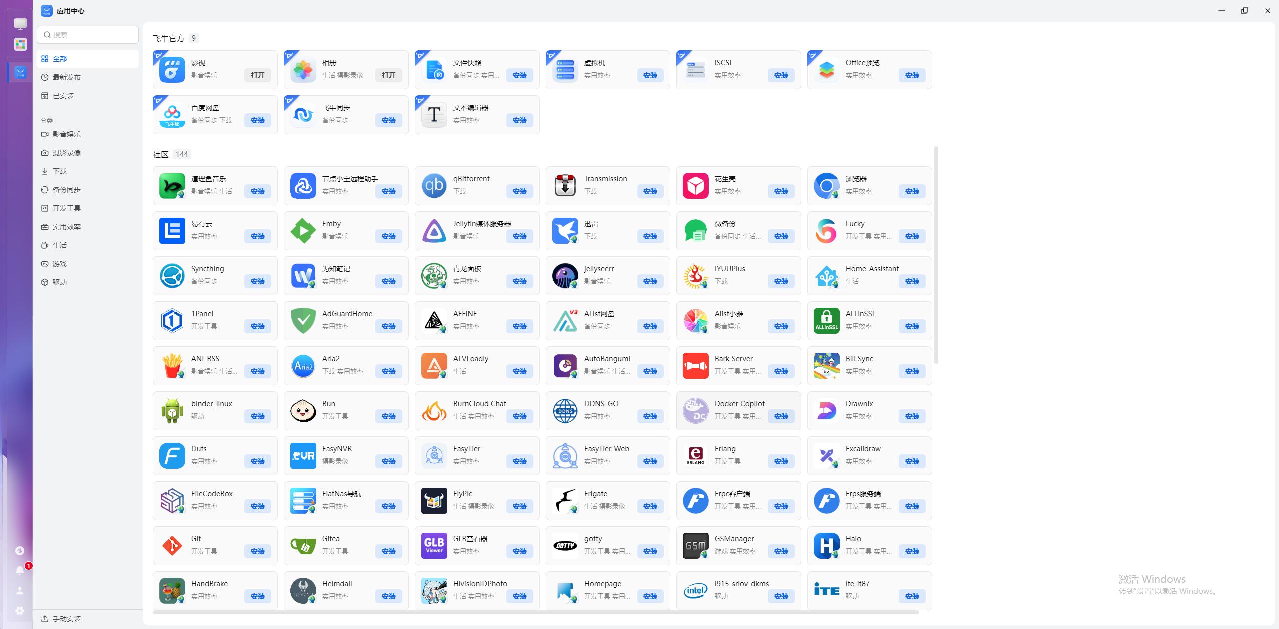 应用中心资源比较齐全,安装方便,日常主要使用的下载、影音播放,手机数据备份等软件功能都挺完善的。飞牛fnOS系统里官方自带9款应用,配备了个人比较刚需的相册和影视功能。