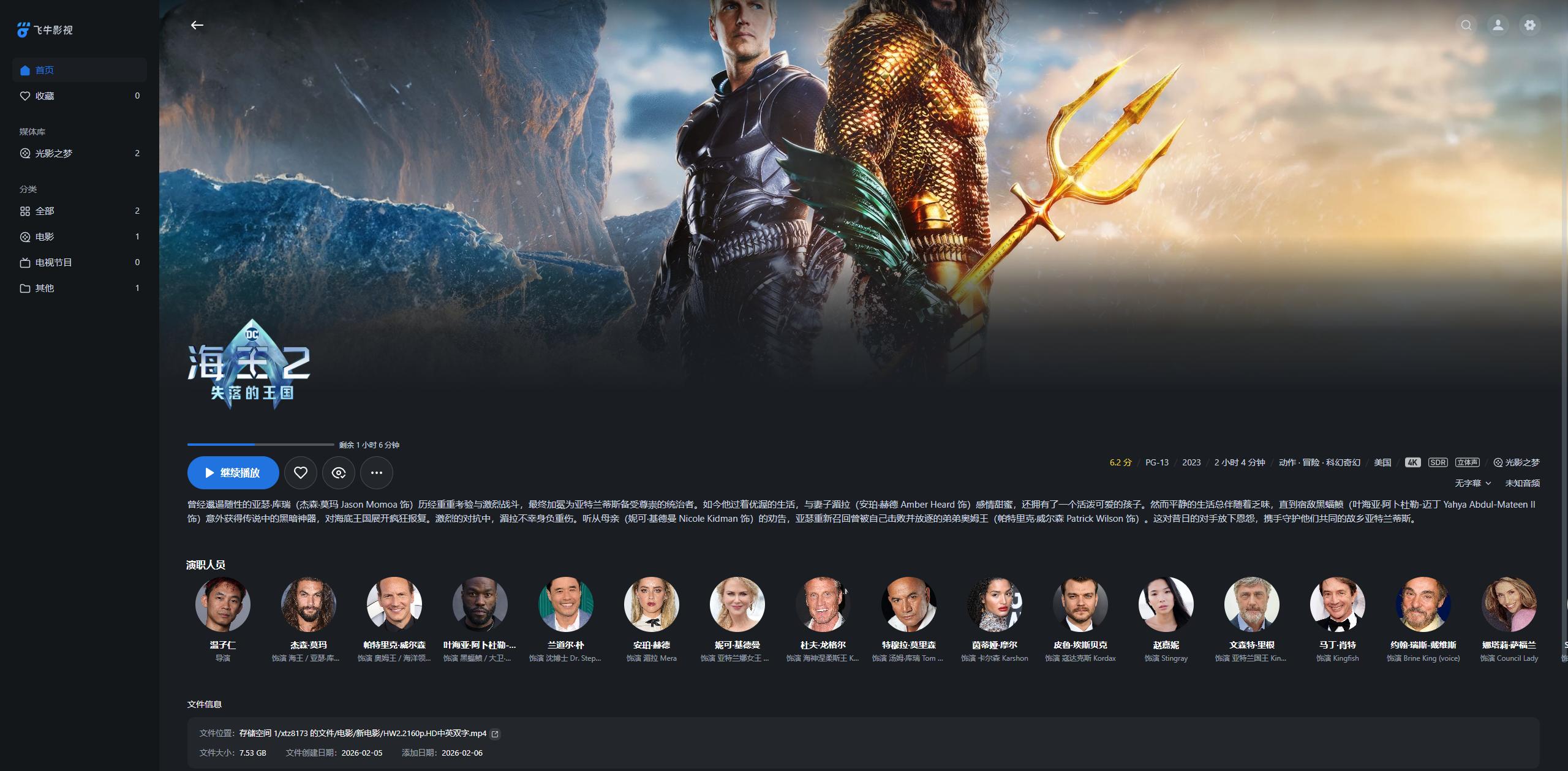 飞牛影视界面设计精美,会自动为我下载的电影匹配海报和简介,对影片库进行智能分类整理,识别准确率相当高,整个影视资源库一目了然,找电影很便捷,连接电视后,孩子和老人可以在电视上直接观看家庭相册、动画片和电影,操作简单无学习成本。