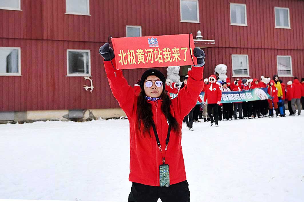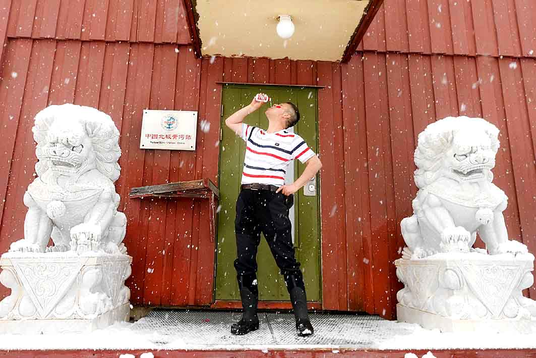站在“中国北极黄河站”门口石狮前,凡来此的炎黄子孙无不欢欣鼓舞,大家纷纷在雪花飘舞中排队打卡留影。一位来自苏州的男士身着T恤衫,脸上贴着国旗贴,昂头喝起茅台酒,充分展示内心的无比自豪;重庆的两位老姐妹,手持“北极黄河站我来了”不停拍照。一位领队与游客们共同唱起了《黄河之歌》,雄浑的歌声响彻在北极上空!我们骄傲,我们是中国人!歌颂赞美我们亲爱的祖国,愿伟大的祖国越来越繁荣强盛。