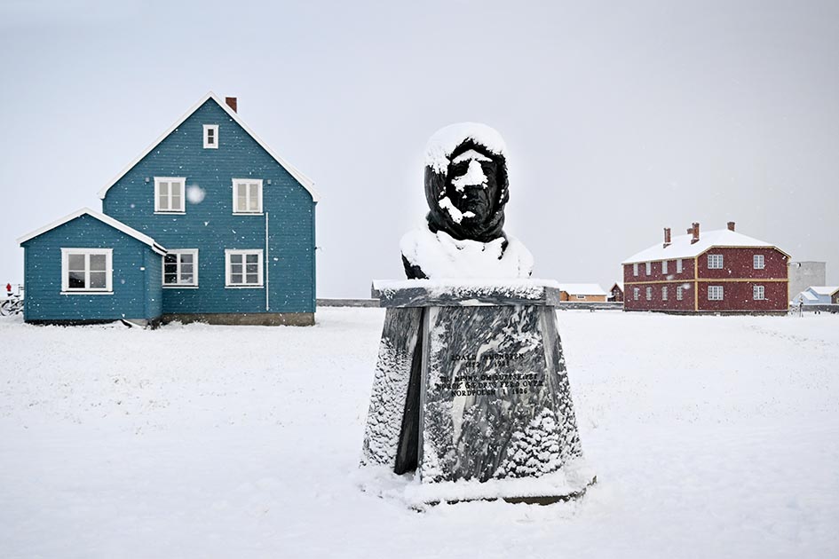 漫步新奥尔松小镇,天空忽然飘起了雪花,迎面可见一尊半身人像雕像,迎风冒雪矗立在路口,这便是挪威伟大的探险家阿蒙森,他一生都敢于接受挑战。上世纪20年代前后,他到达南极极点住了3天;后又与同伴埃尔斯沃思乘坐飞艇,从新奥尔松峡湾飞过北极,到达阿拉斯加的巴罗角,仅用27个小时,行程达5456 公里,成为人类历史上真正到达“地球两极极点”的英雄。