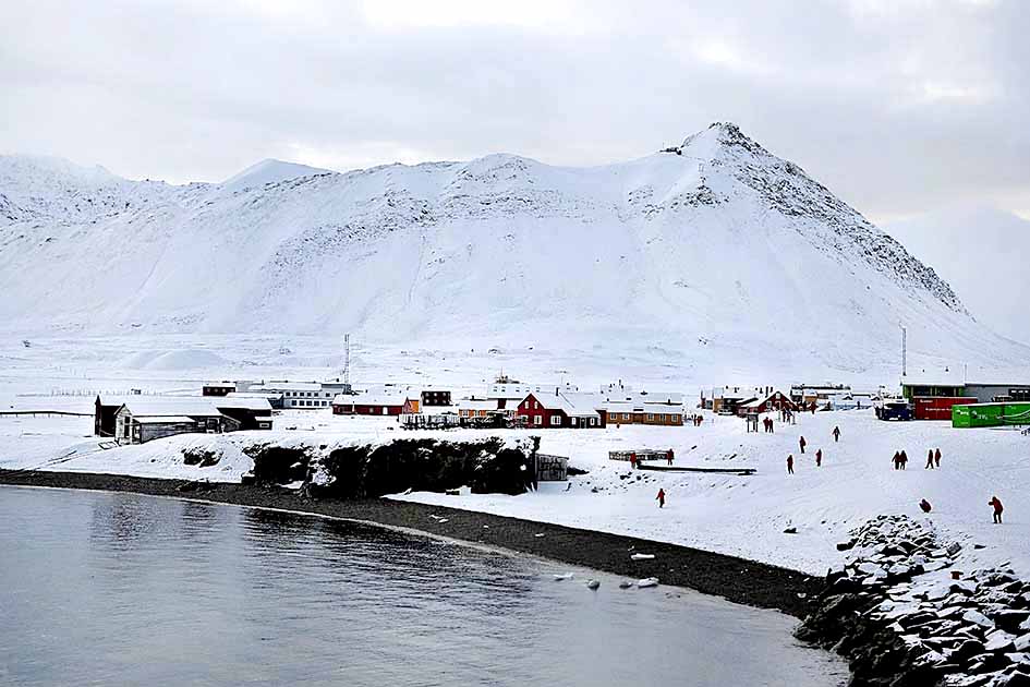 新奥尔松小镇位于斯瓦尔巴群岛国王峡湾,地处北纬78度55分,距离北极点为1231公里,是人类最靠北的永久居住点,镇上仅有60多幢房子,为挪威人建造提供各国科考站租用。目前已有挪威、中国、德国、法国、英国、意大利、韩国和日本等11国在此建立了北极科考站。每年夏季有100多人、冬天仅有40人左右科研人员在此居住,实为名副其实的北极科考“小联合国”。