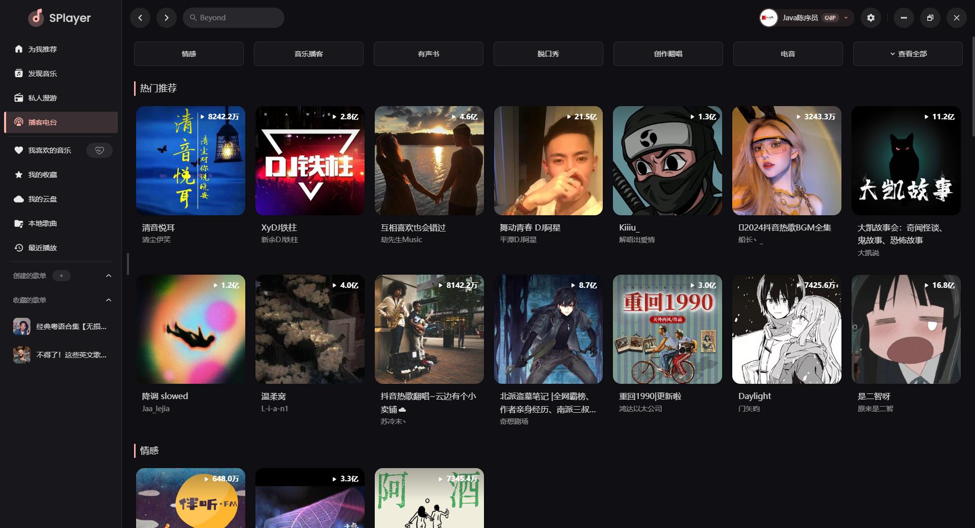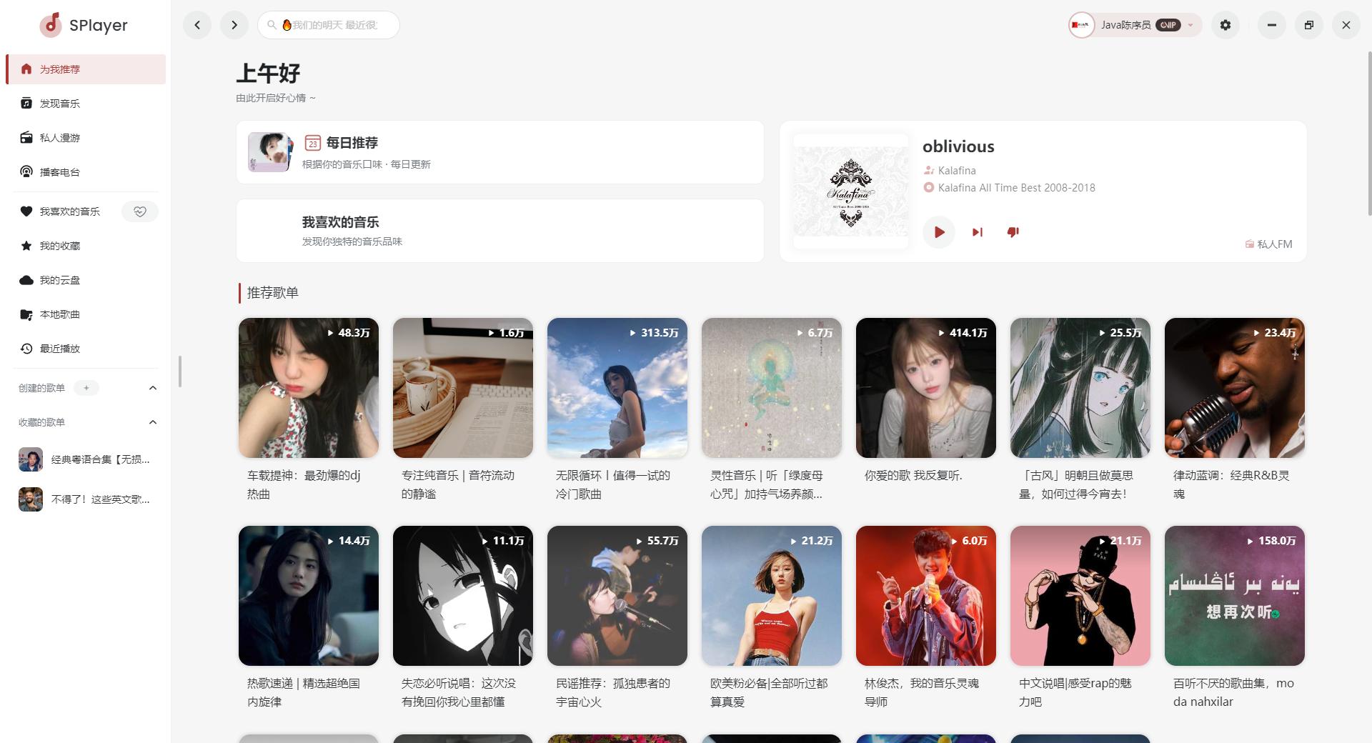 多平台适配:支持网页端和 Windows 桌面客户端,移动端也做了基础适配沉浸式听歌体验:支持桌面歌词,封面主题色自适应;全站色调随歌曲封面变化,视觉感拉满;支持 Light/Dark/Auto 模式自动切换,白天黑夜都舒适本地+在线双模式:支持本地歌曲管理及分类,并提供每日推荐、私人 FM、歌单收藏,发现更多好音乐等,同时支持播放部分无版权歌曲其他细节功能:音乐频谱动态显示,跟着节奏律动;歌曲渐入渐出效果,切换更自然;支持云盘音乐管理,上传、播放、纠正一键操作;支持 MV 与视频播放、评论区互动快速上手桌面端SPlayer 提供了 Windows 版本的安装包,可直接下载进行安装。