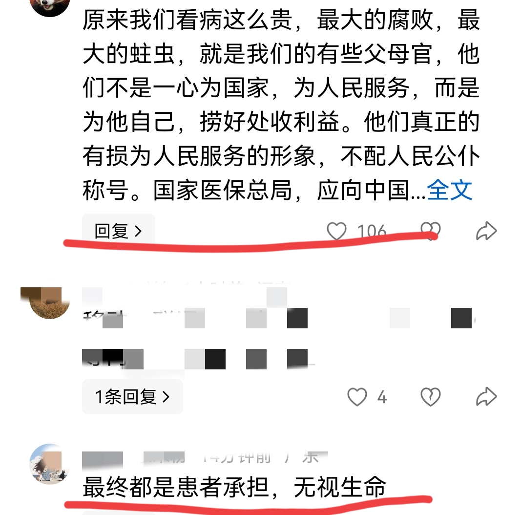俗话说羊毛出在羊身上,老百姓作为整个治疗的终端使用者,无论是药物还是医疗器械,医疗耗材,最终都是由自己的口袋里面掏钱出来购买的,而那些人在各个环节上的“吃拿卡要”,恐怕到最后还是要老百姓自己的花钱买单,可以说大家对于这些人的行为真的早就已经深恶痛绝了啊!
