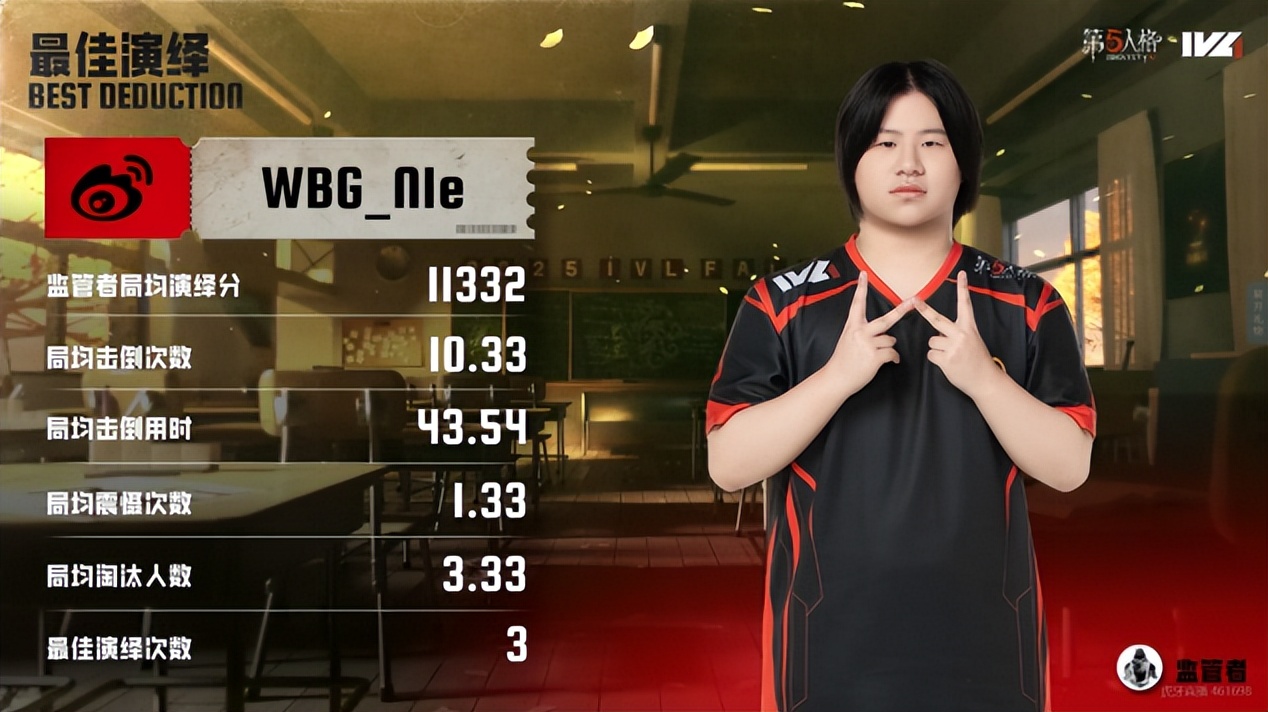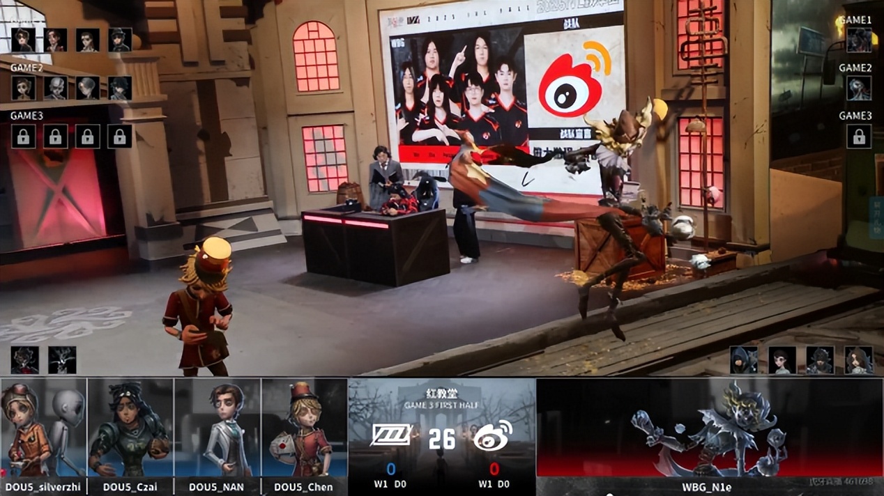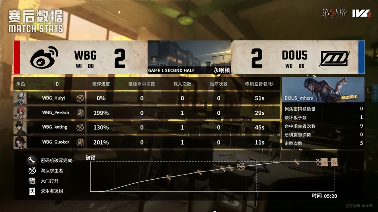 DOU5的求生者选择了机械师、前锋、小说家、邮差(BAN歌剧演员、时空之影);北京WBG的监管者N1e选择了“喧嚣”。(BAN先知、古董商、飞行家、“心理学家”)