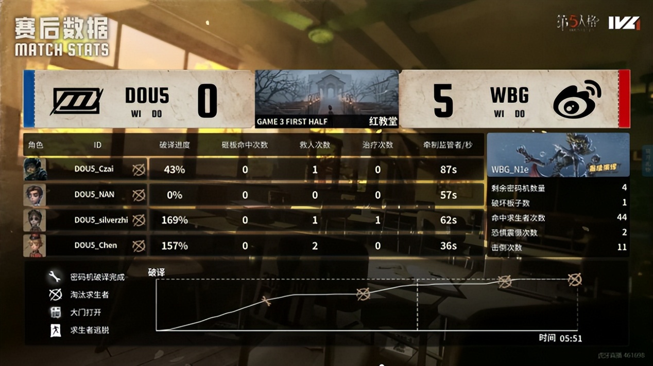 DOU5的求生者选择了入殓师、空军、“逃脱大师”、病患(BAN歌剧演员);北京WBG的监管者N1e选择了孽蜥。(BAN先知、气象学家、火灾调查员、飞行家)