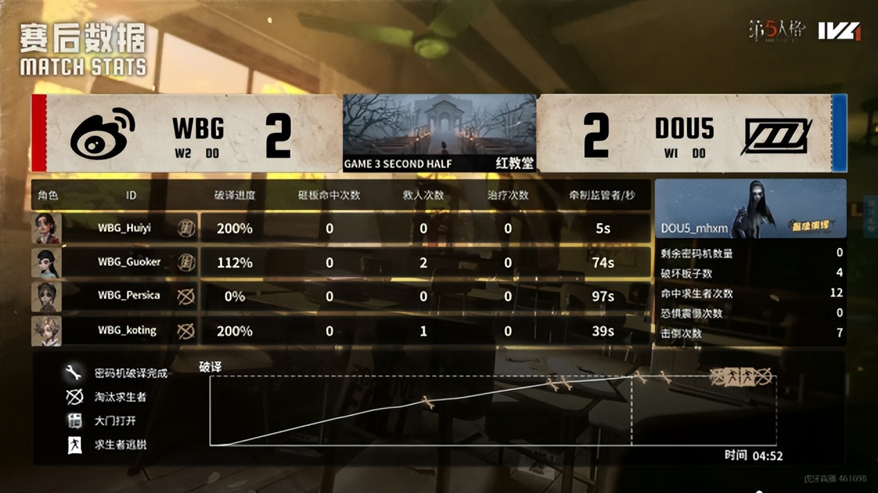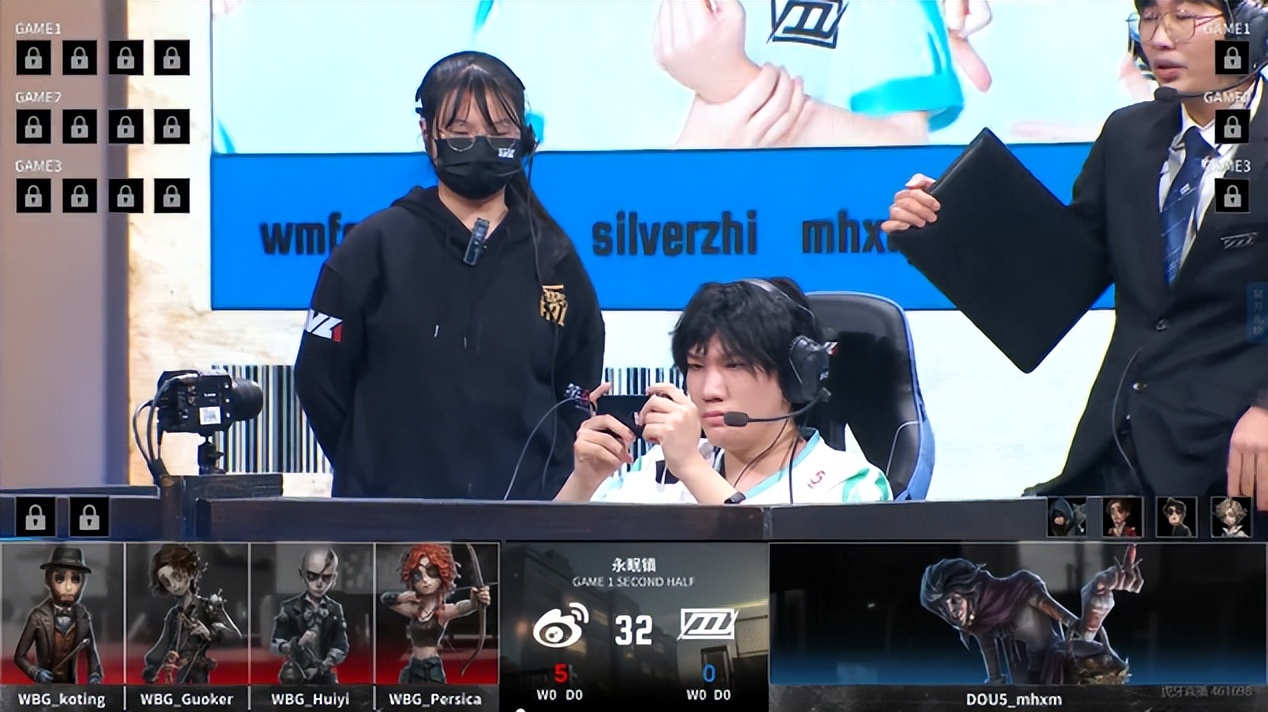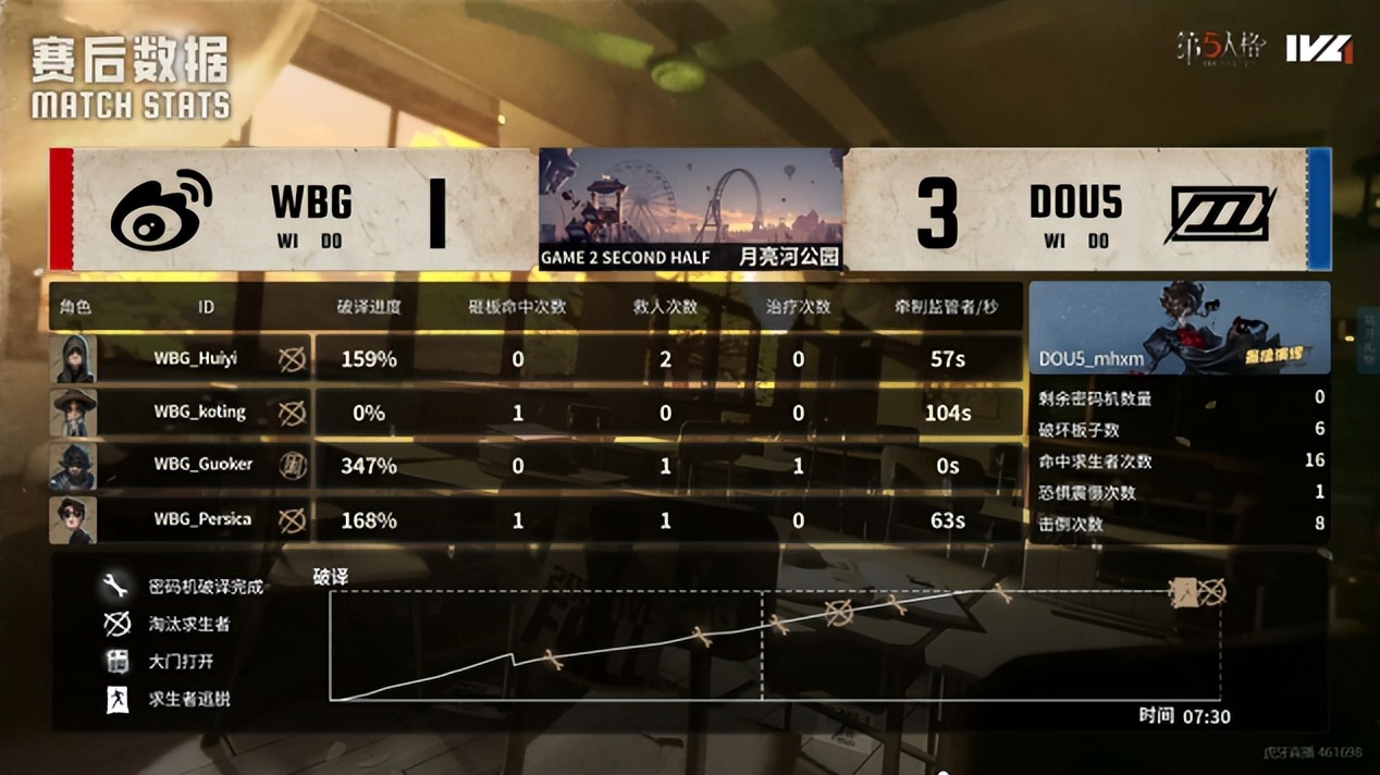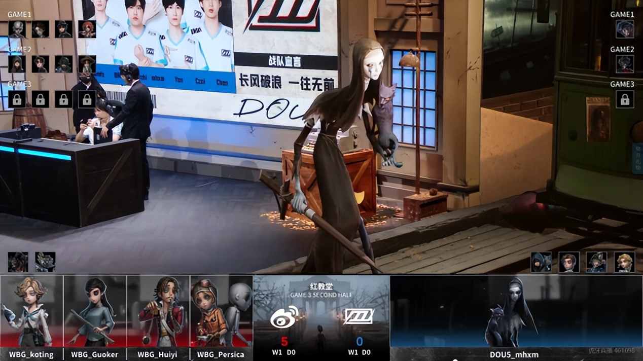 北京WBG的求生者选择了园丁、飞行家、佣兵、幸运儿(BAN“跛脚羊”);DOU5的监管者mhxm选择了歌剧演员。(BAN先知、古董商、气象学家、小说家)