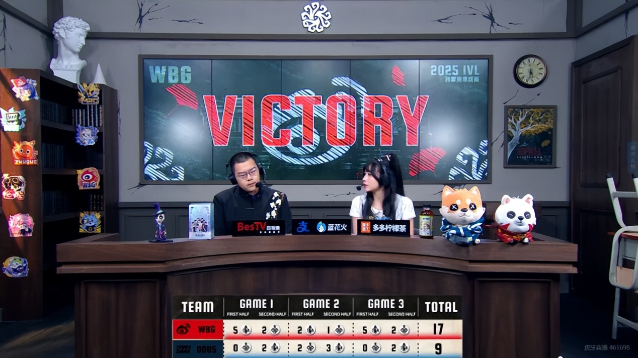 最终,北京WBG以2胜0平1负(17:9)的比分击败DOU5,获得本场比赛的胜利。