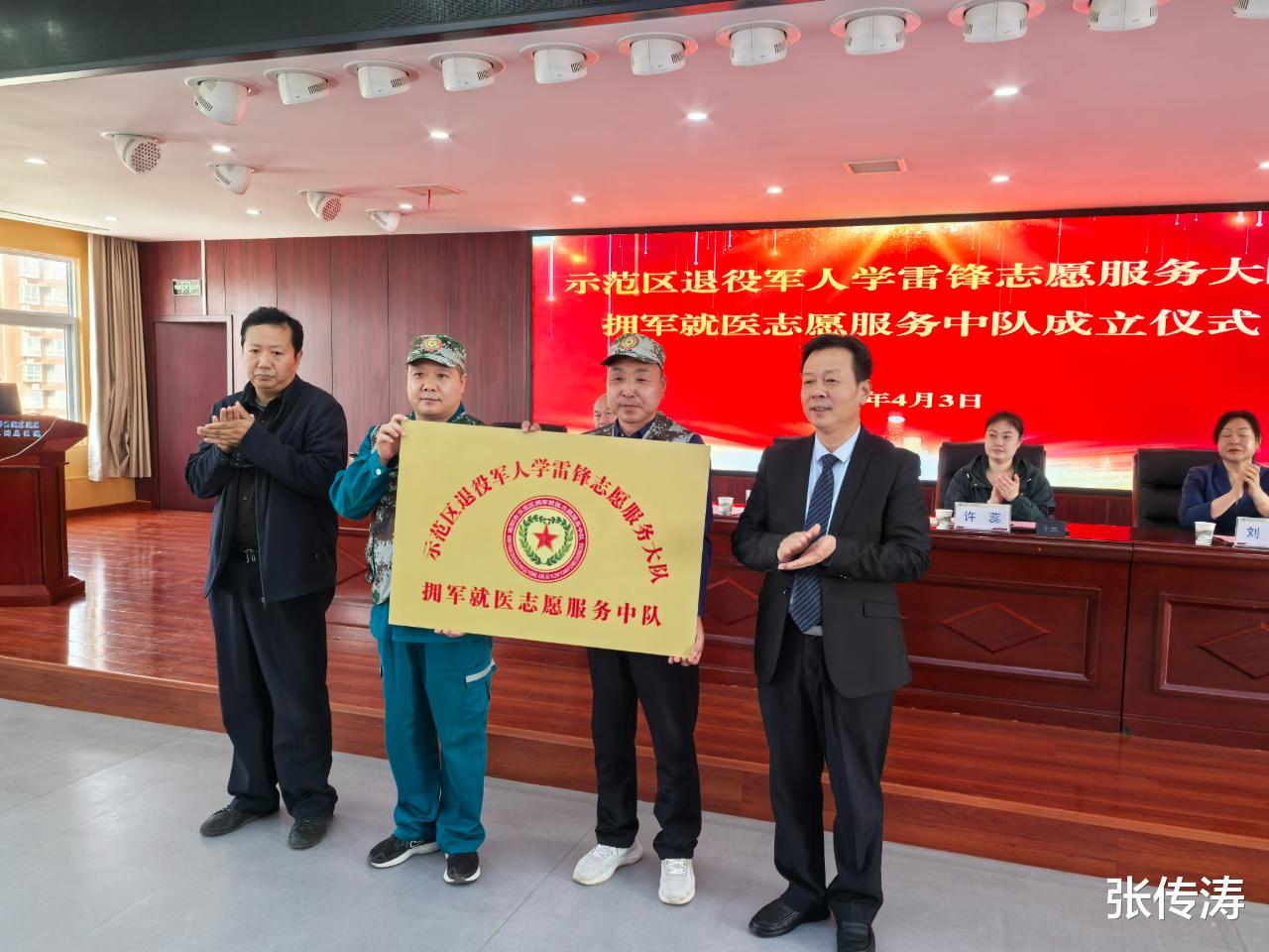 仪式现场,该区退役军人服务中心、退役军人学雷锋志愿服务大队负责人为拥军就医服务中队授旗、授牌、揭牌,任命郑芝龙为中队队长、张传涛为指导员,与此同时,还明确了服务中队的职责使命与工作方向。