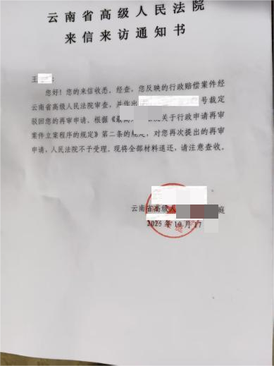 此后,王定财先生向云南省高级法院申请再审,主张原审混淆行政赔偿与征收补偿关系、证据采信存在偏差等问题,2022年高院作出裁定驳回其再审申请。2023年,王定财先生又向昭通市检察院申请监督,检察院作出不支持监督申请决定书,维持原审及再审结果。2026年3月,昭通市中级法院向王定财先生出具信访告知书,建议其服判息诉。