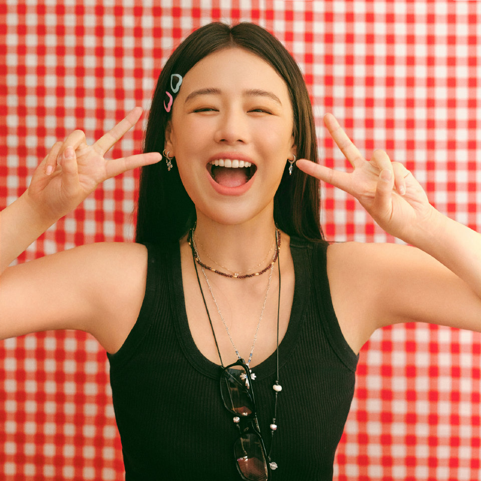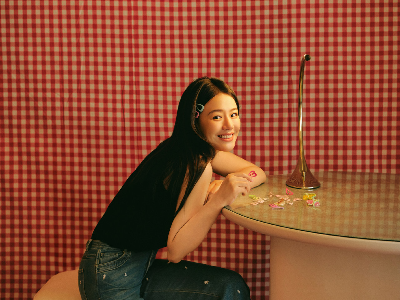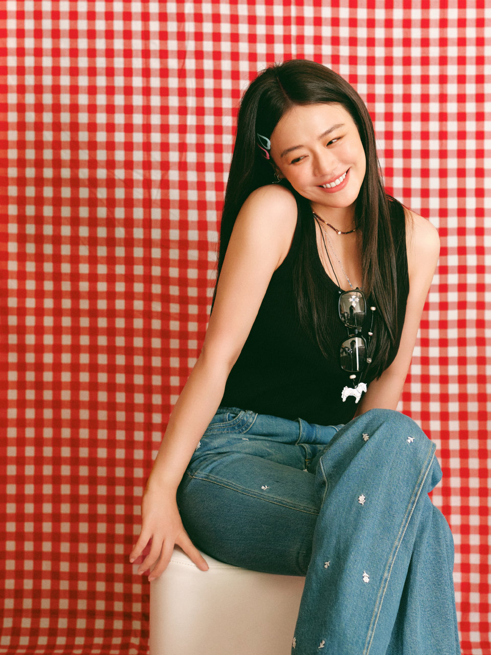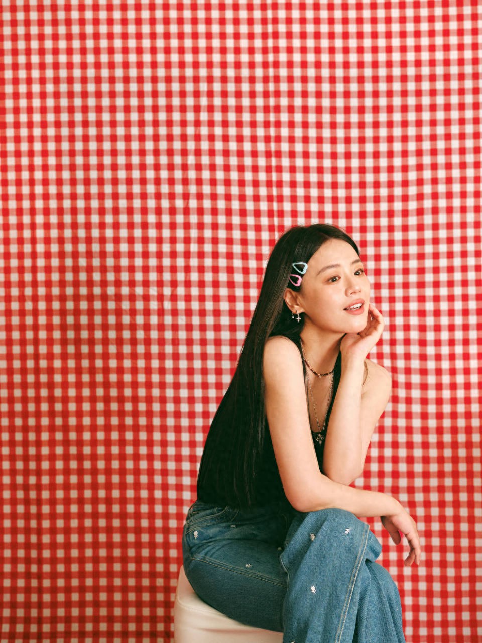 马思纯穿着黑色吊带配牛仔裤写真,明媚动人的大姐姐