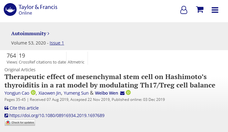 临床进展一项发表在《Autoimmunity》杂志上的研究《Therapeutic effect of mesenchymal stem cell on Hashimoto's thyroiditis in a rat model by modulating Th17/Treg cell balance(干细胞通过调节Th17/Treg细胞平衡改善大鼠桥本甲状腺炎的治疗效果)》给我们带来了一些好消息。研究人员利用雌性SD大鼠构建了HT模型,来评估MSCs对Th17/Treg平衡的调节作用。