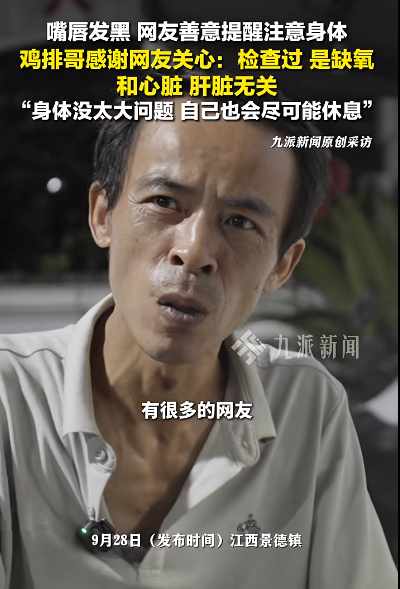 “鸡排哥”本人对此回应称,嘴唇发紫是缺氧所致,他每年都做体检,身体状况尚在可控范围内,并有喝中药进行调理。