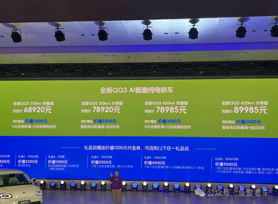 近日,奇瑞全新QQ3正式开启预售,共推出4款车型,官方预售价区间为6.892-8.9985万元,搭载猎鹰500辅助驾驶系统,纯电动力。下面就带大家看一下。