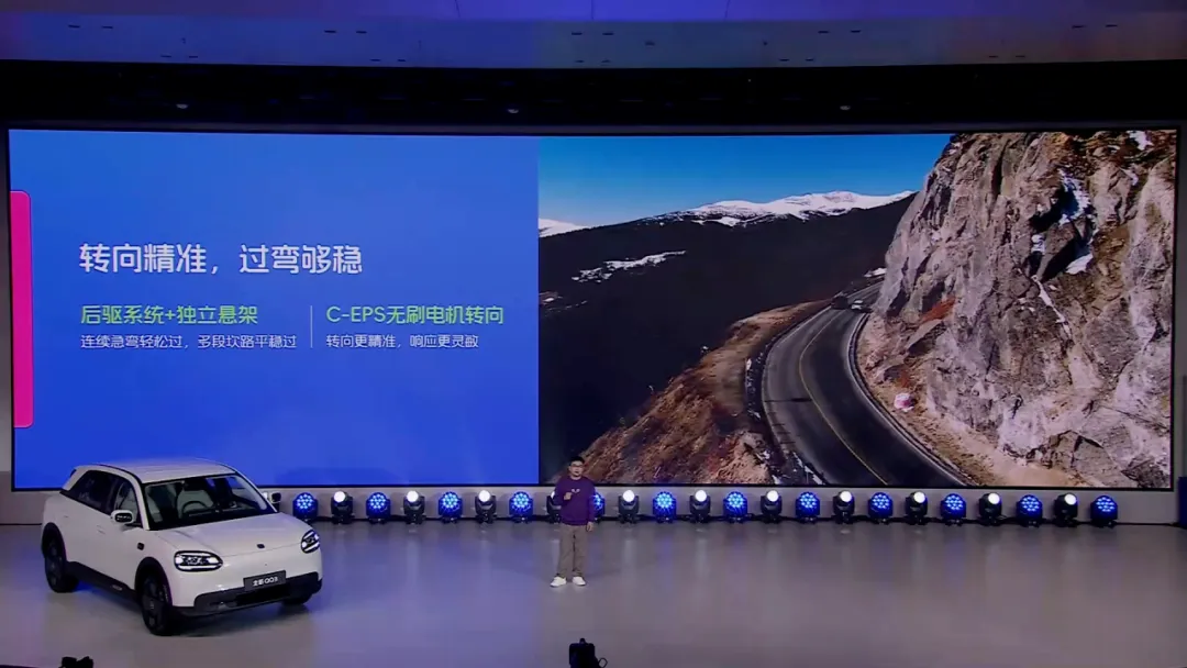 底盘操控方面,新车采用同级罕见的后置后驱布局 + 多连杆独立后悬架,前后轴荷比达到 50:50,搭配 205mm 同级最宽胎宽、CC-EPS 无刷电机转向系统,在复杂路况下展现出优异的过弯稳定性、颠簸滤震能力与转向精准度。