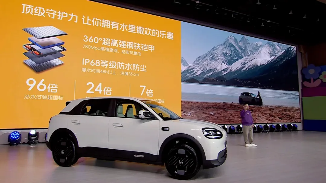 在安全方面,全新QQ3提供全域磐石车身,高强度钢占比达72%,热成型钢占比19%,一体式热成型门环设计,电池提供360°超高强钢铁铠甲守护,IP68防水防尘,浸水时间48h以上,深度35cm,可以说全维度安全防护。以及配备了刹车辅助、胎压监测、ABS防抱死、制动力分配,低速行车警告灯。