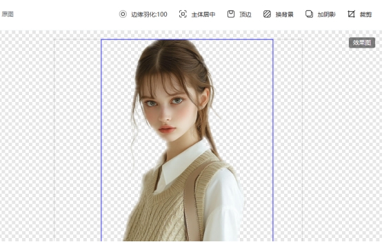 2、专业级细节优化与编辑:除了上述的 AI 自动抠图之外,易可图也支持手工二次调整的功能,你可以利用画笔工具细致调节抠图边缘,让复杂的头发丝以及透明材质都能被精准分离出来。除此之外还有丰富的后期效果可以选择: