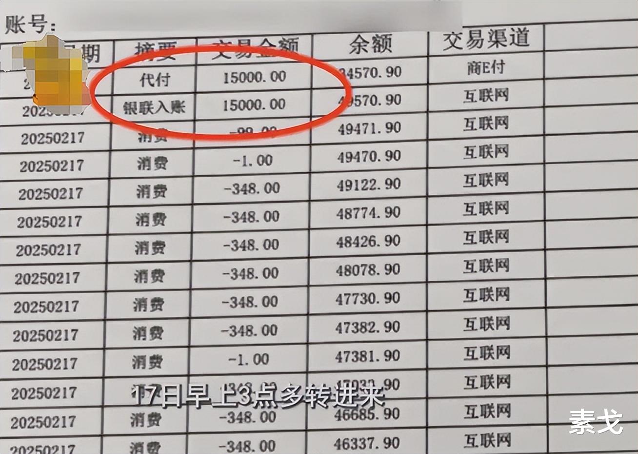 先是莫名收到两笔入账,接着系统就显示连续100多笔分别为348元的支出,总金额达到五万元。