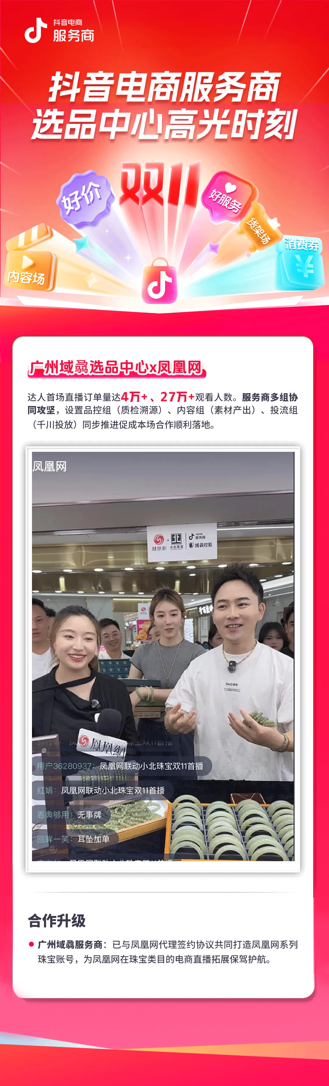 除本次入选抖音电商官方平台的“凤凰网x小北珠宝”的案例外,域骉选品中心自运营以来,便联手权威媒体与抖音头部商家打造了多场高品质直播,如: