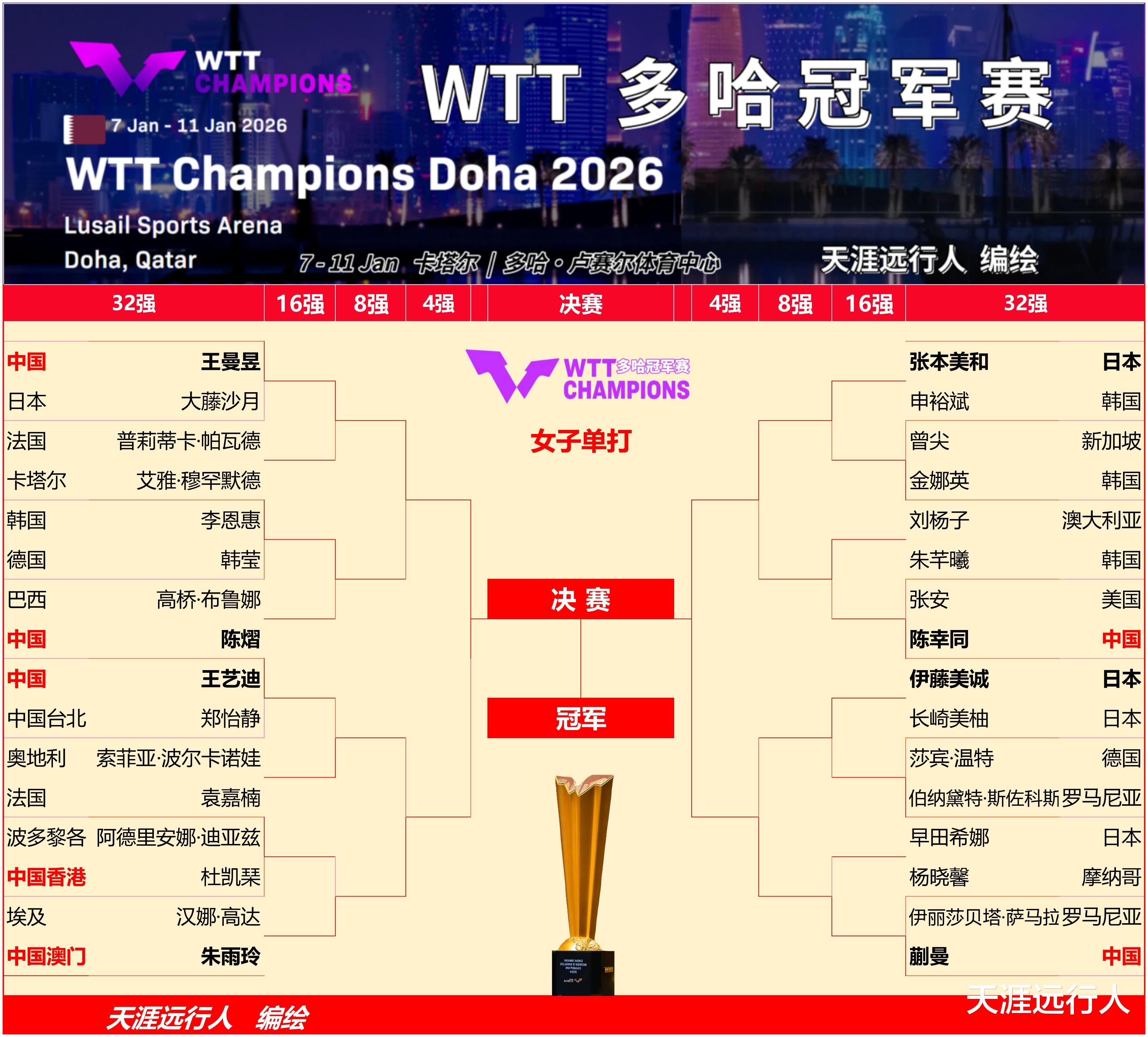 2026世界乒联WTT多哈冠军赛女子单打进程签表