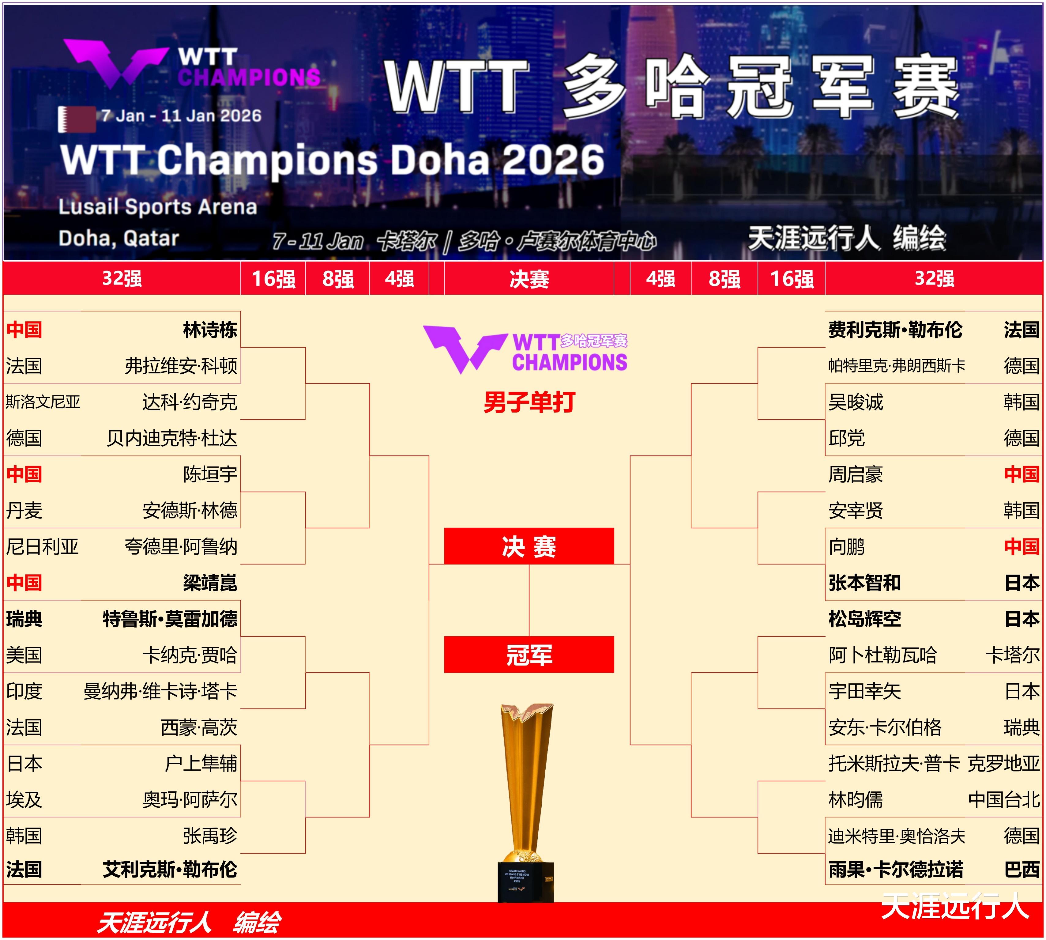 2026世界乒联WTT多哈冠军赛男子单打进程签表
