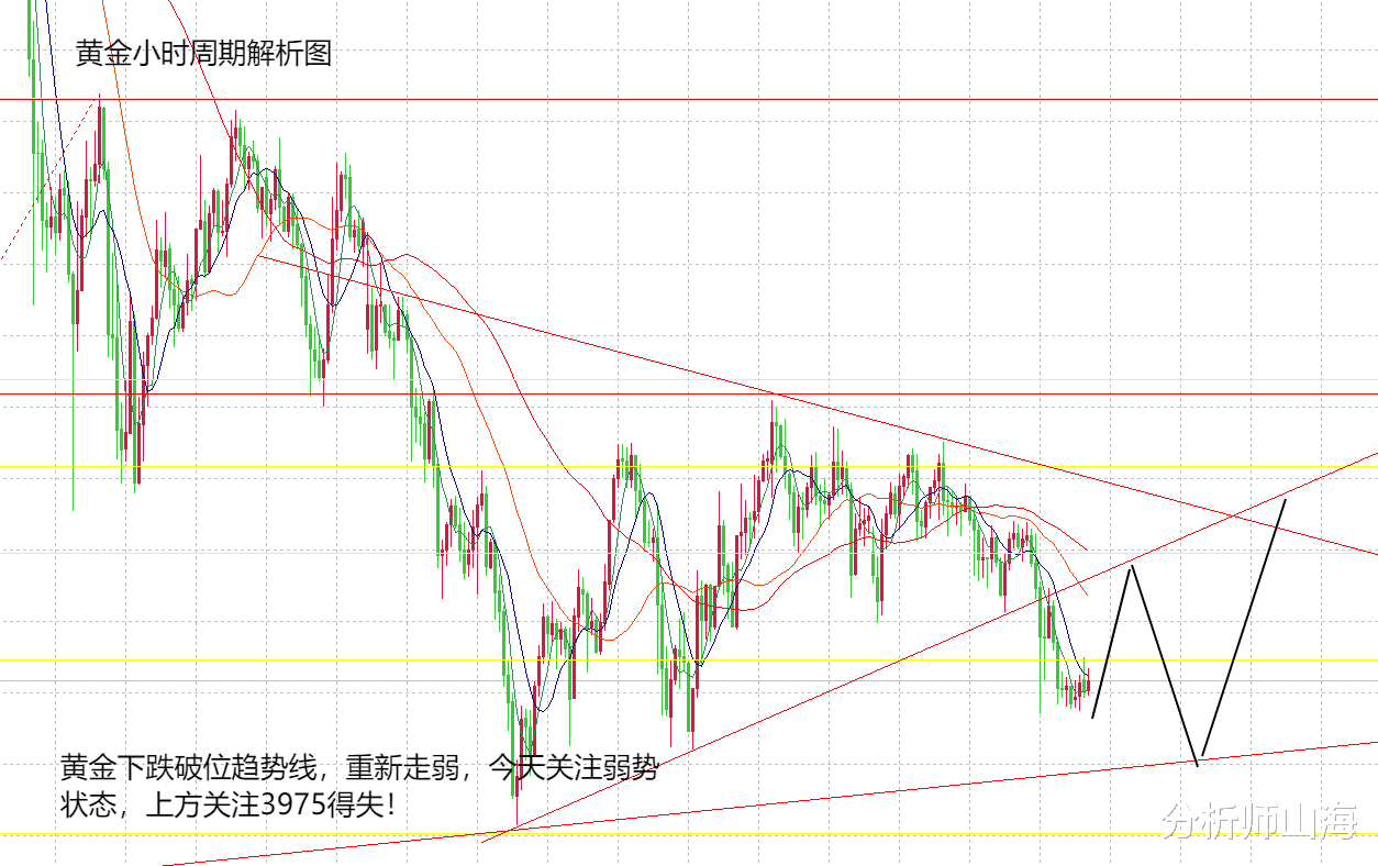 周二黄金从4000下跌到3930,对于这种行情不能看多空的延续性,还是要低位震荡,前期黄金从3880上涨至4050,那么大的力度,多头也未能延续,所以,这波也不一定能延续。暂时的黄金还是以震荡的走势来看比较合理。当然,由于周二的下跌,现在黄金肯定是偏弱的,技术面日线大阴收跌,还是没有走强,那么,日线可能会延续弱势继续收阴,这也符合日线周期在布林中轨之下连跌的表现,因此,今天大概率还是弱势走势,要反弹做空。但是需要注意得失,这波下跌,H4周期其实并没有打开布林下轨,反倒是在今天既有可能会再次上涨,k线有收到H4周期的均线之上,如果形成这个可能,价位上必须站稳在3975之上,那么,H4就形成收口,再继续上看4000,4050。因此,今天分两部分看,如果破位3930,下方就去3900或者3880做多看反弹,但也有必要在周二低点3930支撑尝试性做多看反弹力度,不破3975短线获利了结,看是否能反手做空,破位3975,震荡形成再看延续的上涨空间,或在美盘借助ADP数据影响,上涨到4000,4050高点。