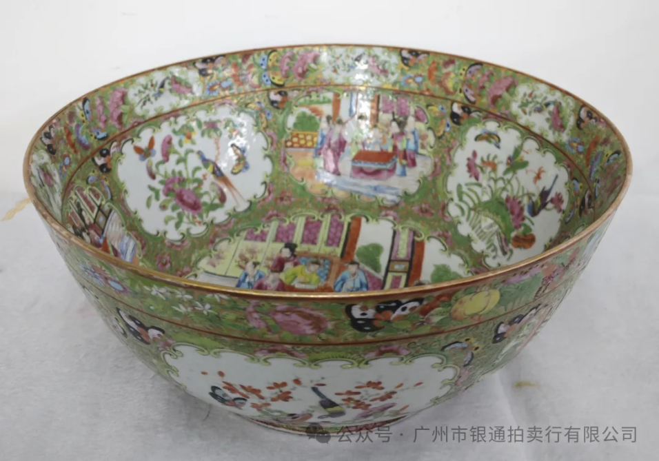 广彩(广州织金彩瓷)始于清代康熙,是为外销而创的彩瓷品种,由广州画匠在景德镇白瓷上彩绘,以“色彩浓艳、金彩繁多” 为特点,题材多为人物故事、西洋风景,体现中西方审美融合,是清代外销瓷的代表。这件高 14.5cm、口径 33.5cm 的清代广彩大碗,是典型的外销瓷样式。碗内壁开光绘 “人物故事”:或为仕女游园,或为文人雅集,人物衣着色彩浓烈(粉红、翠绿、明黄),配金彩勾边,富丽堂皇;开光之间饰花鸟、蝴蝶纹,碗外壁绘折枝花卉,整体 “满工满彩”,符合西洋市场对 “华贵” 的审美。金彩用量大,与彩料结合紧密,釉面光亮耐磨;绘画风格兼具中国传统线描与西洋写实,人物比例略带西画特征。大碗器型硕大,适合宴会使用,既体现了清代广州对外贸易的繁荣,又展现了 “中西方文化碰撞” 的艺术特色,是外销瓷中 “工艺与市场结合” 的典范。