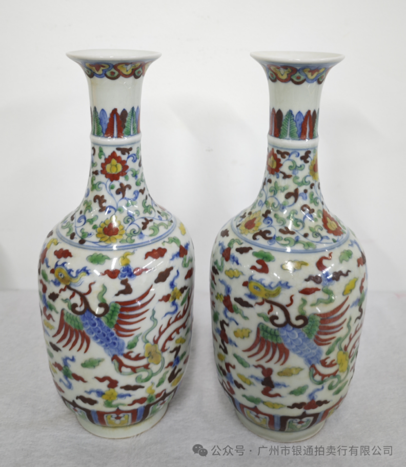 斗彩工艺创烧于明宣德,鼎盛于成化,是“釉下青花勾勒轮廓 + 釉上彩填色” 的复合技法,因 “釉下、釉上色彩争奇斗艳” 得名。此对赏瓶属明代成化时期官窑器,成化斗彩以 “轻、薄、艳” 著称,凤纹是明代宫廷核心吉祥纹饰之一,象征 “祥瑞太平”,赏瓶则是成化朝新兴的陈设器型,专供宫廷赏玩。瓶高22cm、口径5cm,器型为撇口长颈、溜肩敛腹,胎质细腻洁白(成化瓷 “白如凝脂” 的特征)。瓶身以斗彩绘凤穿缠枝纹:釉下青花勾勒凤羽与花枝轮廓,釉上填红、黄、绿等色,凤身舒展灵动,羽毛以细笔晕染出层次,缠枝花卉色彩明丽却不艳俗。颈部饰蕉叶纹、底足绘回纹,均是成化官窑的标准边饰。成化斗彩存世极少,此对赏瓶形制规整、色彩清雅,既展现了斗彩 “淡描青花、浓填彩料” 的工艺精髓,也以凤纹传递了明代宫廷的祥瑞审美,是成化官窑的珍品。