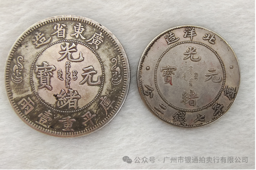 光绪元宝是晚清机制币的标志性品种,始铸于 1900 年,标志着中国货币从方孔钱向近代机制币转型。这两枚对应 “库平七钱二分”(壹圆)规格,由北洋、湖北等省局铸造,是晚清币制改革的产物 —— 彼时清政府引入西方造币设备,试图以统一形制的银元规范货币体系,缓解银钱混乱的财政困境。光绪元宝的发行,既是工业文明对传统货币的冲击,也反映了晚清 “师夷长技” 的近代化尝试,其 “中体西用” 的纹饰设计(汉字 + 英文 + 龙纹),正是时代转型的缩影。两枚均为机制银元,总重 64.2g,正面珠圈内饰 “光绪元宝” 楷书,外环铸 “北洋造”“湖北省造” 省名与 “库平七钱二分” 重量;背面中央铸五爪蟠龙纹,鳞爪刻划细腻,龙身矫健,外环英文标识。材质为银铜合金(含银约 90%),色泽银白泛浅褐包浆,边缘齿纹清晰规整,无磕碰痕迹。两枚钱币工艺精湛,钱文深浅均匀,龙纹立体感强,既保留了传统龙纹的吉祥寓意,又以机制币的精准形制,展现了近代造币技术的进步。