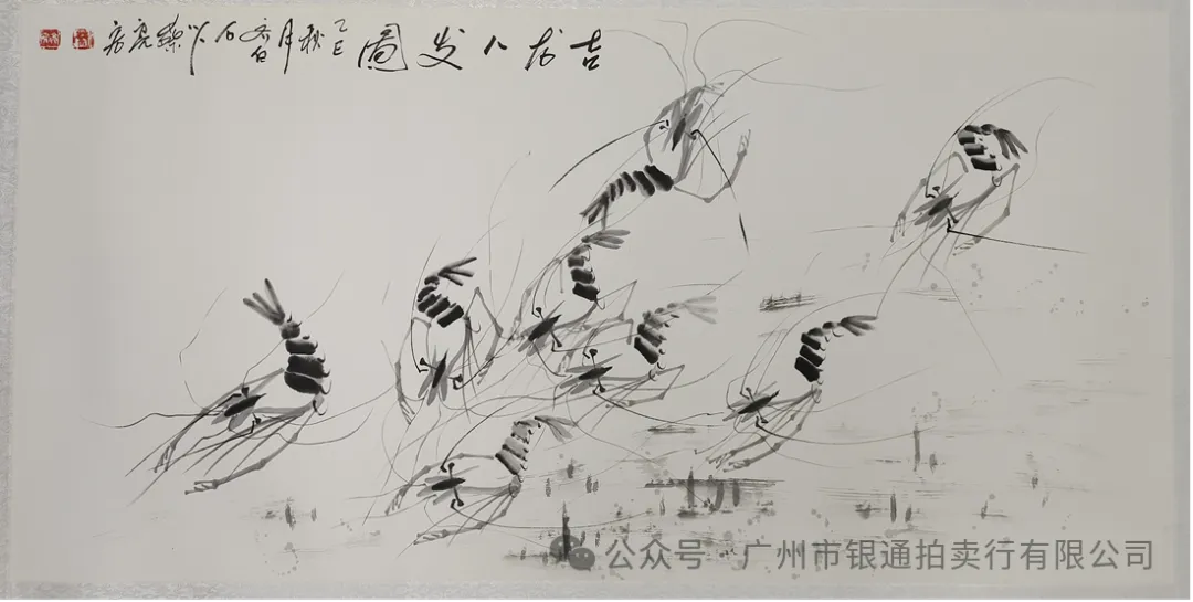 这件长 137.5cm、宽 68.5cm 的作品,是蔡亮宏 “水墨虾” 题材的代表作。画面以 “群虾游动” 为核心,采用 “齐白石虾画法”—— 虾身以浓淡墨块表现,虾须、虾钳以细劲线条勾勒,八只虾动态各异,或聚或散,显灵动活泼;背景以淡墨点染水草,与虾的浓墨形成对比。题款 “吉龙八发图 乙巳年秋月亮宏画” 以行书落于卷首,“吉龙” 谐音 “吉荣”,“八发” 暗含 “发达”,是典型的吉祥寓意题材。蔡亮宏既传承了齐白石 “水墨虾” 的笔墨精髓,又以 “群虾构图” 增强画面的生动性,是当代水墨写意中 “以传统技法绘吉祥题材” 的作品。