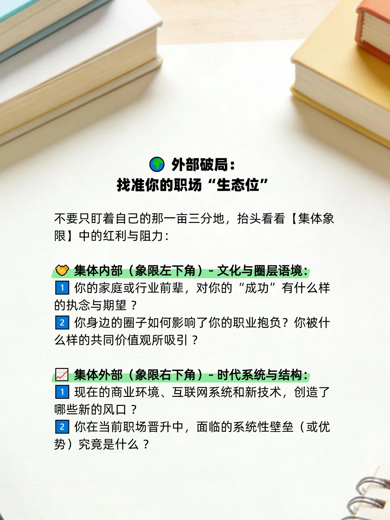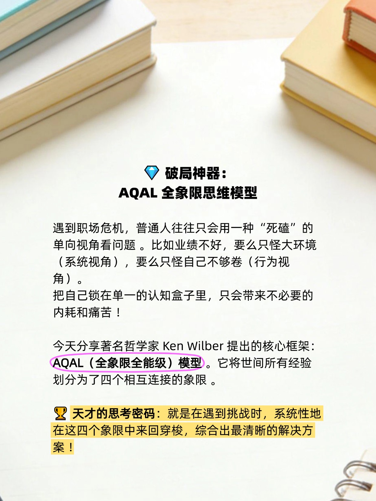 但这套 AQAL 模型 告诉我们,真正解决问题的方法,永远在更高的维度。当你把个人能力、内心渴望、圈层文化和时代风口这四个象限彻底打通时,你的职业规划就不再是一句空洞的“我不知道”,而是一张无比清晰的破局地图 。