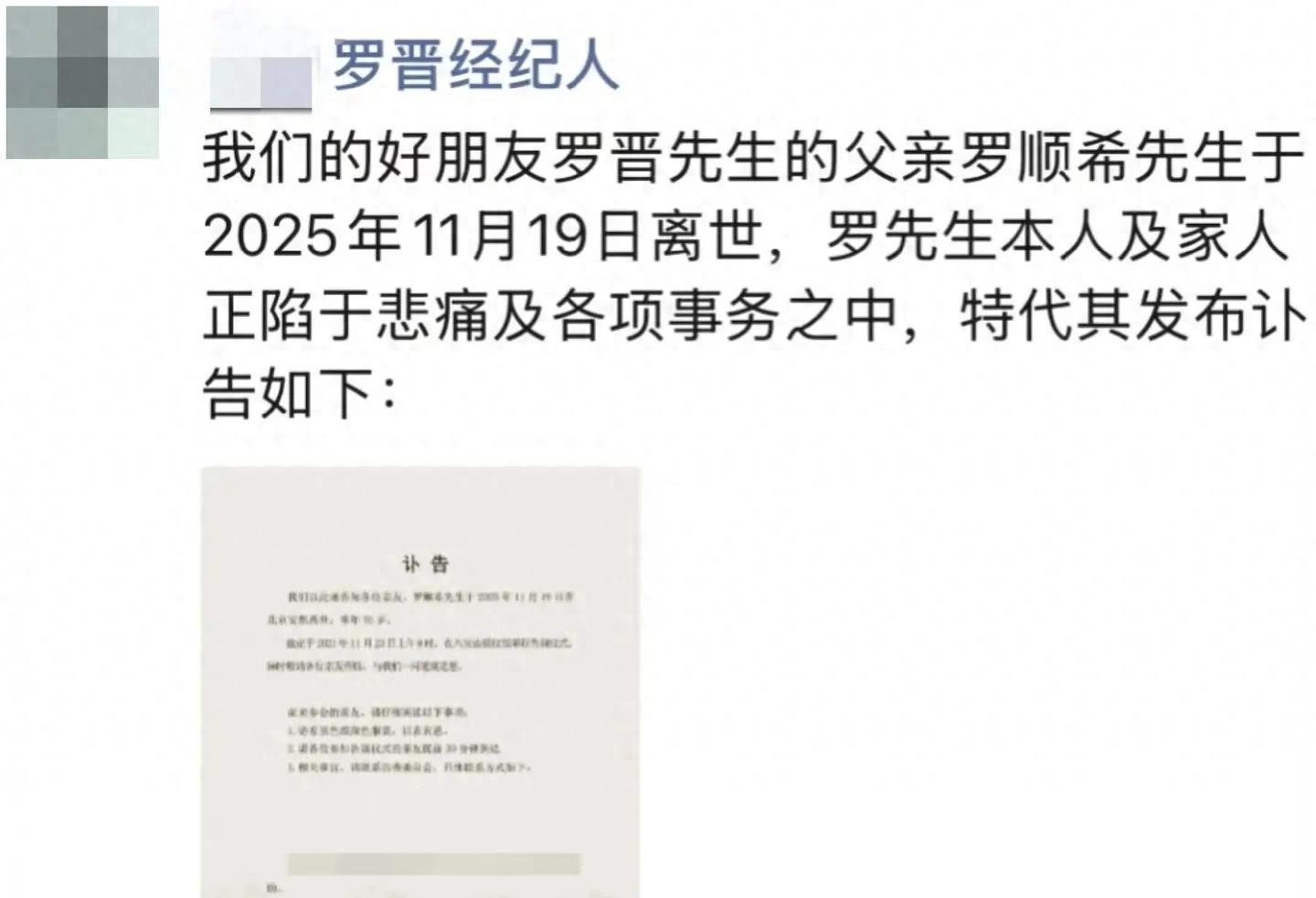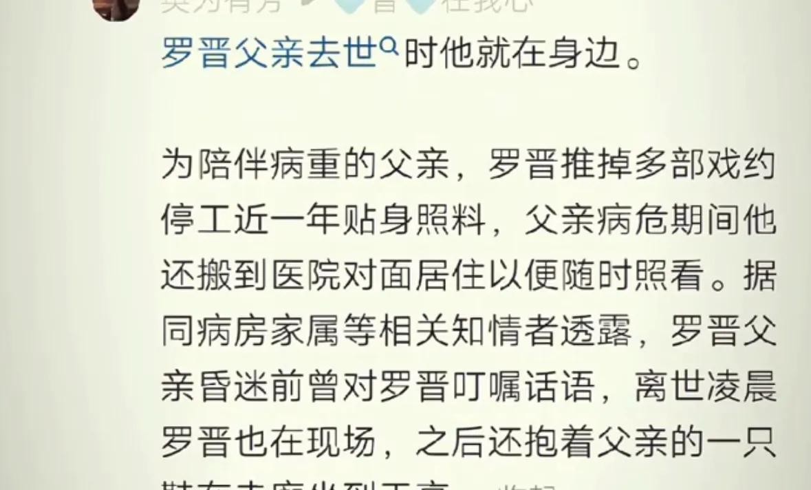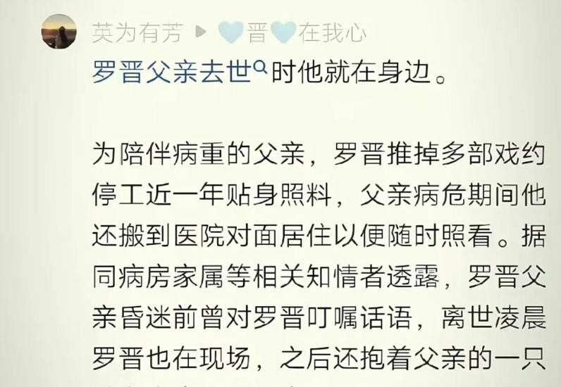 11月19日罗晋父亲在北京去世,20日北京八宝山殡仪馆举行了告别仪式。罗晋经纪人当晚发讣告,提到老人安然离世享年70岁。现场有人拍到罗晋抱着父亲遗物坐在灵堂,一直守到天亮。