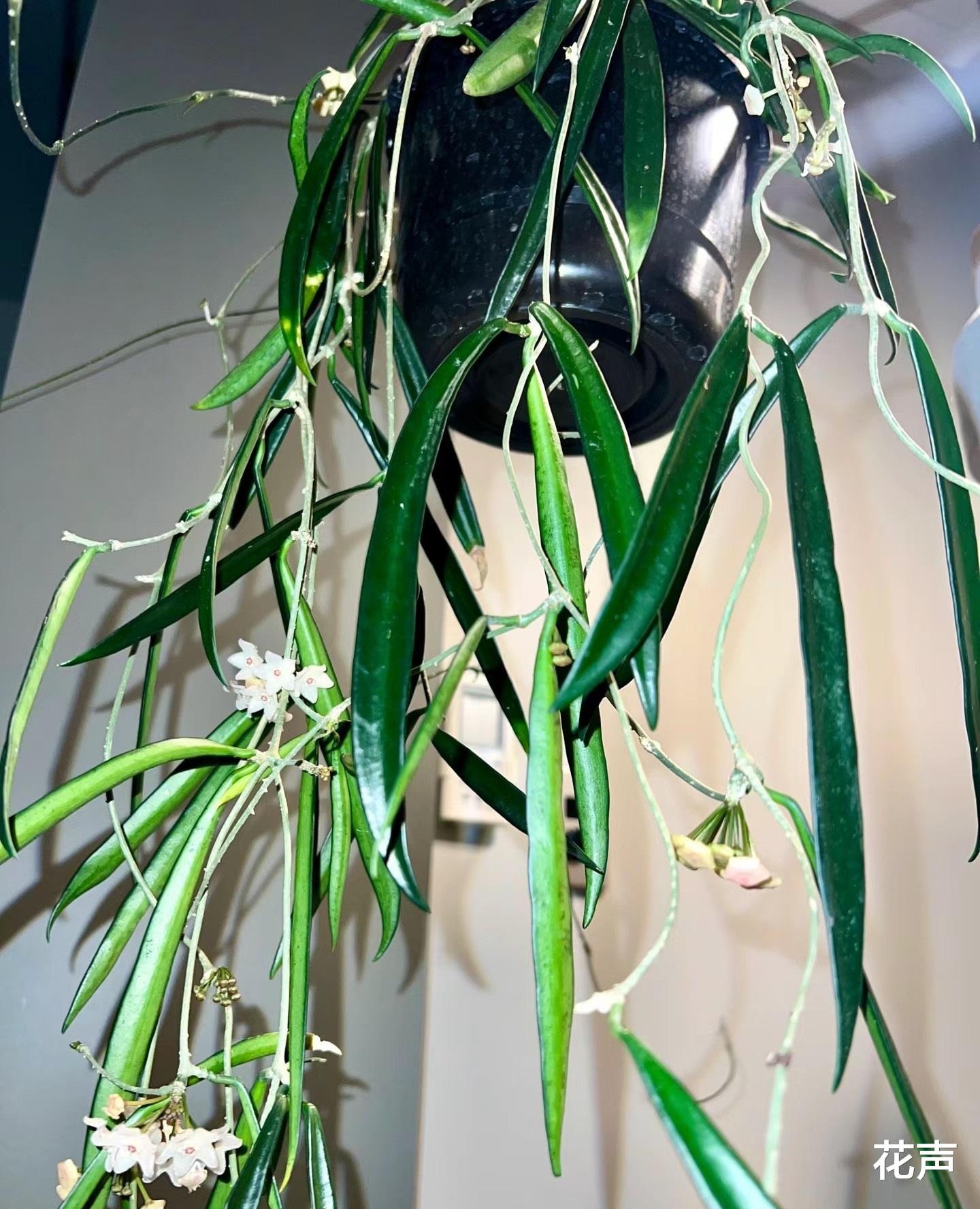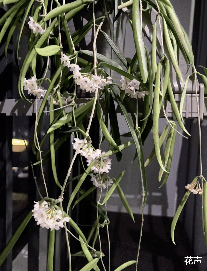 这种花就是“牧羊人球兰”(Hoya Shepherdii),别名舍费尔德,是球兰家族里一个很出色的品种,它的枝条自然垂落,姿态飘逸,且生性皮实,耐阴耐旱,在室内栽植也毫无压力,使它成为室内垂吊绿植界的“天花板”级别品种,备受花友们喜欢。