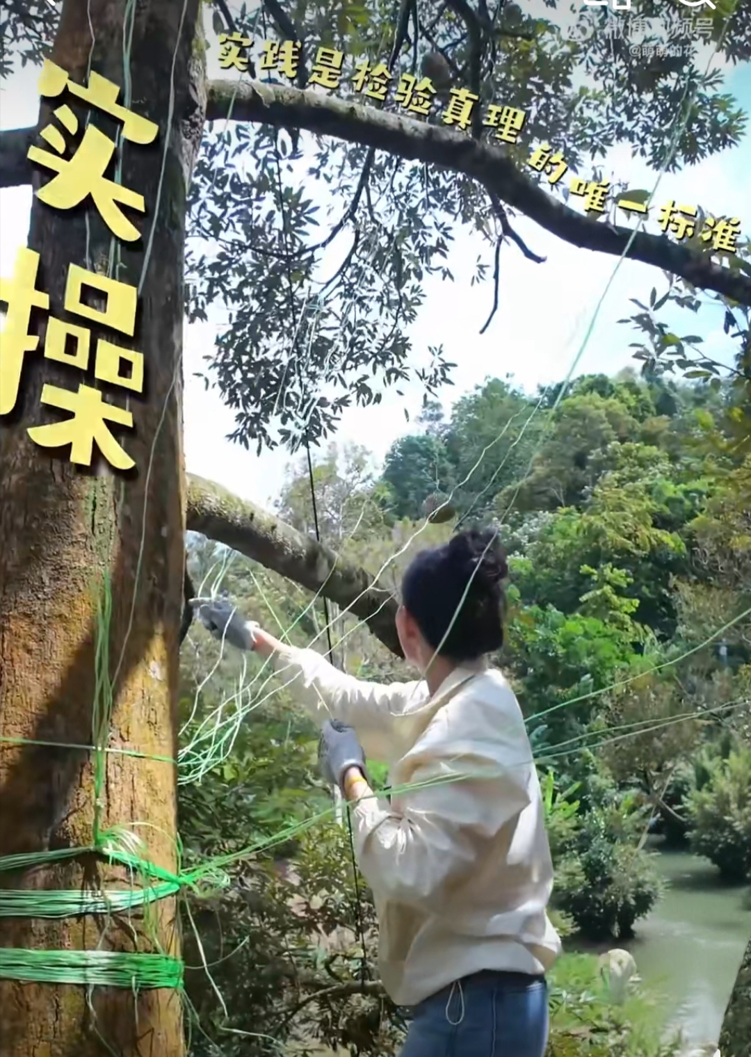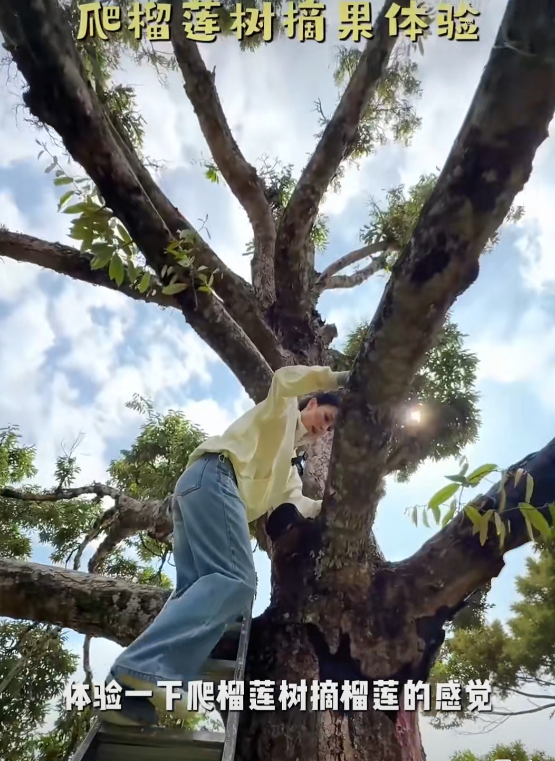 她还给大家展示了爬榴莲树摘榴莲的快乐,有些榴莲很矮的,爬上去伸手就能摘到,胡静调皮的表示视频看起来很高,其实爬上去才两米的距离。