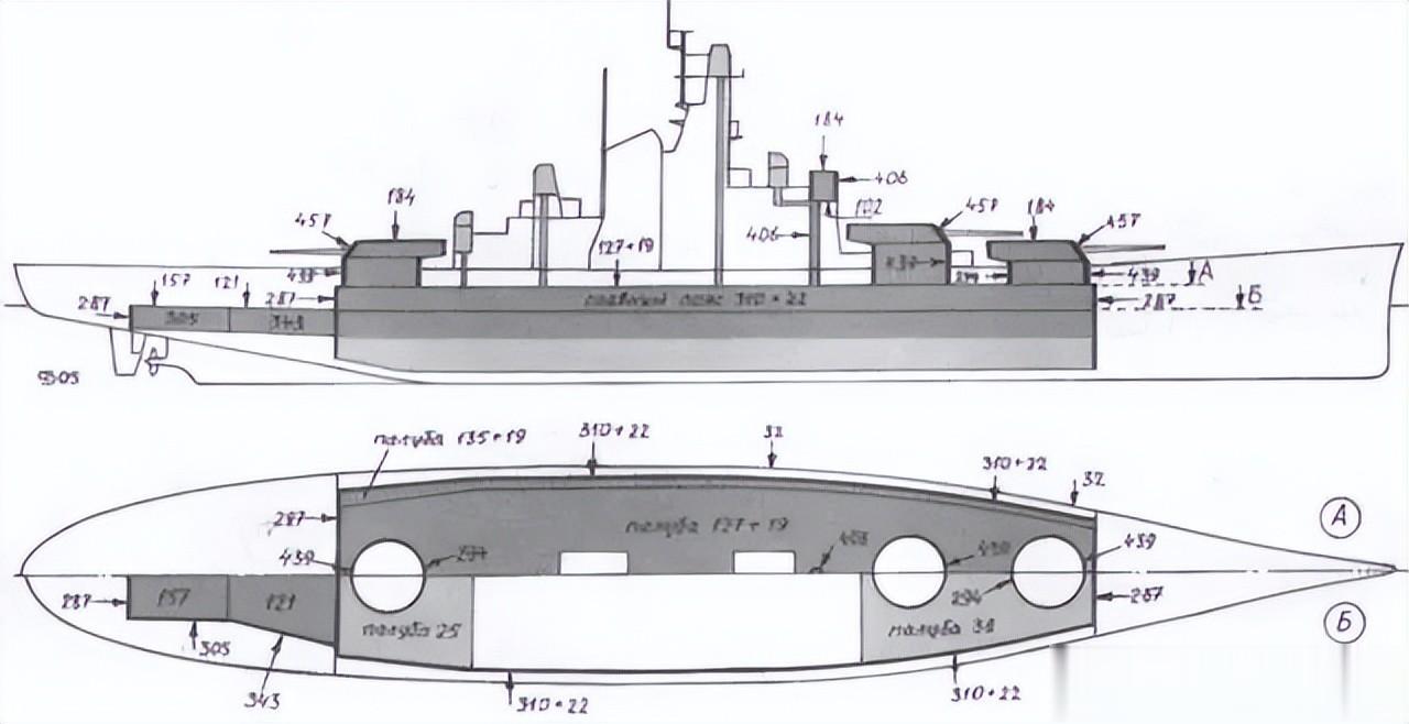 4、装甲防护其核心防护为一条最大厚度310毫米的克虏伯渗碳装甲带,以19度角向内倾斜,并安装于船壳板之后。这种设计使炮弹命中时穿甲路径更长,等效防护厚度可达440毫米。装甲带下缘延伸至三层底,与水下防护结构整合,构成了完整的“装甲堡垒”。但该设计的代价是,一旦外部船壳破损,修复内部装甲将极为困难。