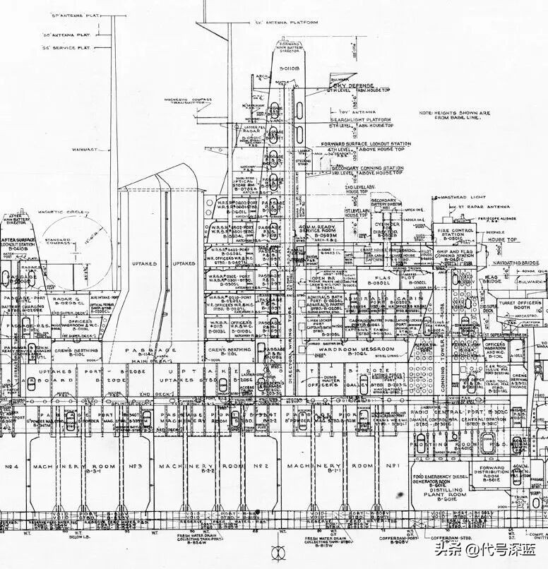 舰桥剖面图,从遥测仪到船体三重底共高17层