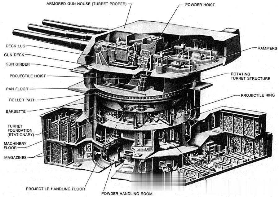然而,主装甲带的设计陷入了困境:若要抵御自身同型的16英寸火炮在25000码距离上的射击,装甲带厚度需增至15.5英寸,这将导致排水量严重超标。最终的解决方案是采用了革命性的内置倾斜装甲带设计。将厚达12.2英寸的装甲带以19度角向内倾斜布置在船壳内侧,其防护效能相当于17.3英寸的垂直装甲。