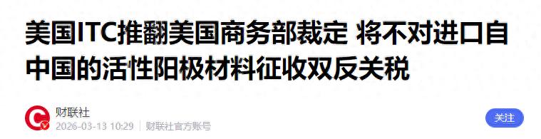 美国国际贸易委员会(ITC)突然官宣,直接推翻美国商务部的此前裁定,明确不对中国活性阳极材料征收反倾销税、反补贴税。