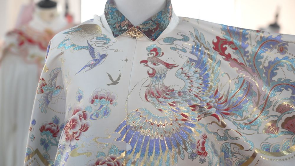 在当地原创汉服品牌洛如嫣的展厅里,设计师向记者展示了一款名为“百鸟朝凤”的明制汉服。它在制作过程中采用了对花工艺等技术,保证了图案的美观和完整性,提升了服饰的精致度与艺术价值。