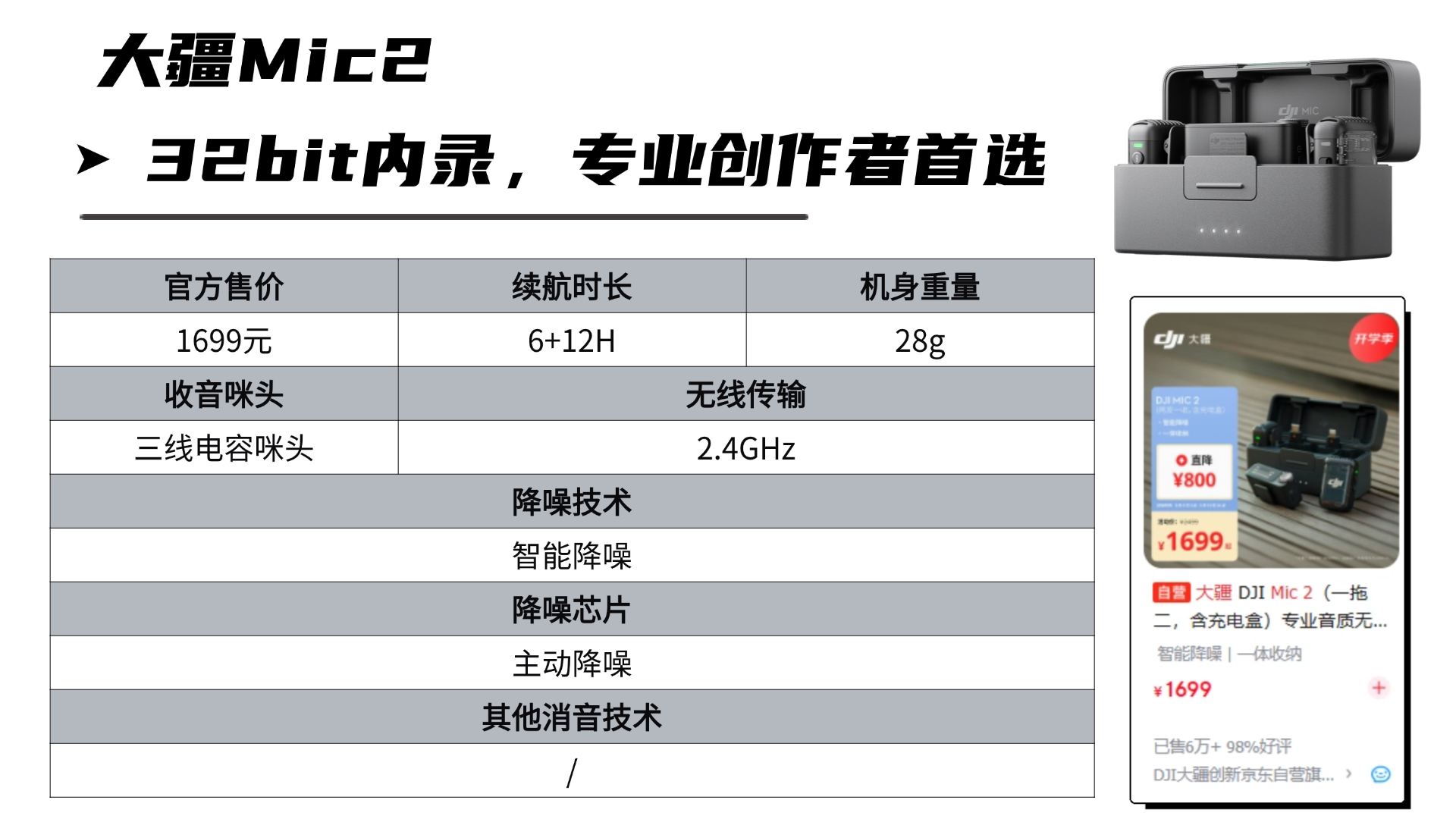 西圣Mike2不仅性能出色,更是一款行业良心之作。它抛开浮夸噱头,专注收音精准、传输稳定和耐用性,让每位创作者都能享受顺畅、高效的录音体验。无论是自媒体拍摄、课堂教学,还是采访录制,它都能稳定发挥,让创作从此无忧。189元就能入手全能无线领夹麦克风,这个价格能享受的专业音质和稳定表现,其他品牌难以企及,真的是闭眼入也不亏。·进阶需求——大疆DJI Mic 2