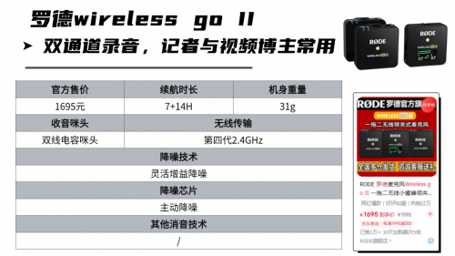 罗德作为澳大利亚高端麦克风品牌,以稳定的录音品质和专业音频表现著称,Wireless Go II是经典系列升级版。它采用全指向收音设计,并支持48kHz采样率,使人声还原度高且细节丰富。麦克风具备双模式降噪技术,可根据不同场景自动优化,保证声音清晰自然。即插即用操作简便,发射器和接收器均配备Type-C接口,支持快速充电,单次续航可达7小时。Wireless Go II兼容性强,可连接多台设备,适合自媒体创作、远程会议及现场录音等多种使用场景。用户普遍反馈其收音稳定,环境噪音处理能力优秀,是专业创作者入门和升级的可靠选择。