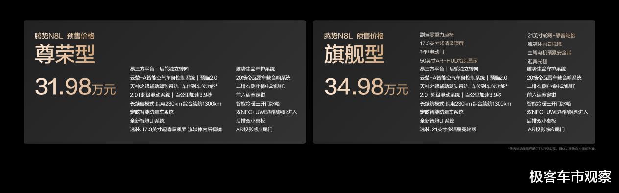 9月26日,腾势汽车全新大六座安全豪华SUV——腾势N8L正式开启预售,预售价31.98万至34.98万元。作为与科技安全旗舰SUV腾势N9一脉相承的家庭豪华伙伴,腾势N8L与腾势N9共同构成了腾势品牌独有的旗舰豪华双子星矩阵,分别瞄准不同细分市场。腾势N9定位科技安全旗舰SUV,科技力拉满、豪华感给足,更追求旗舰的科技性能。腾势N8L则是更聚焦家庭的安全豪华SUV,继承了N9的安全技术和灵活驾控,打造科技舒适豪华空间,更追求家庭的豪华舒享。