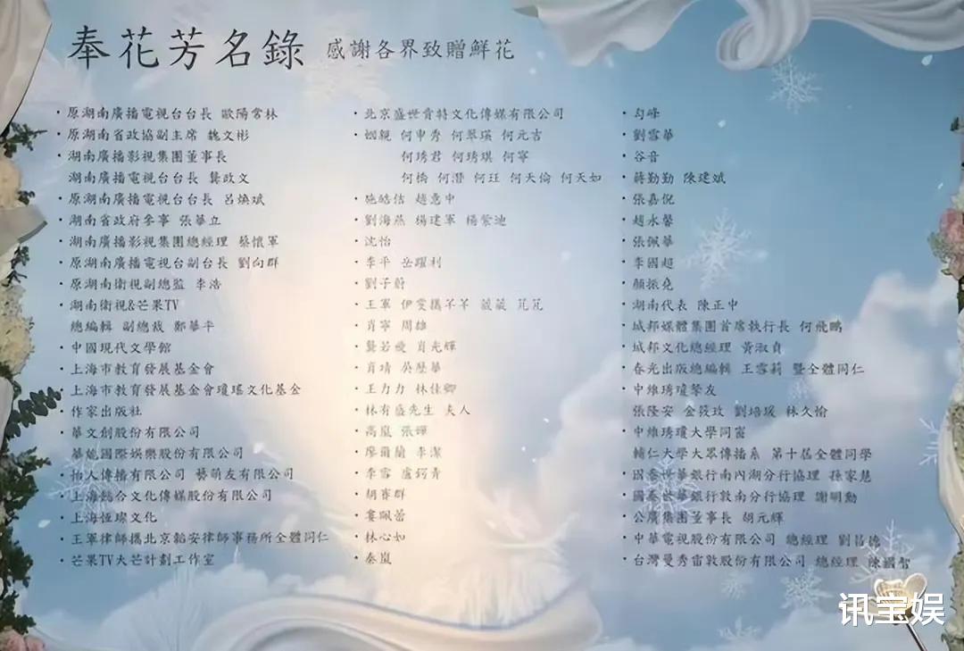不少圈内艺人送花篮惦念琼瑶女士,奉花芳名录中可以看到前湖南台台长欧阳常林的名字,也是他担任台长期间和琼瑶在电视剧方面有着密切合作,推动了琼瑶作品在内地的影响力。